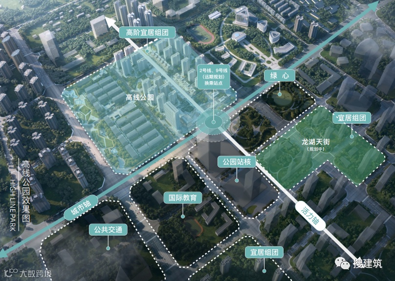 整个五常车辆段项目TOD规划有“三轴一径一核心”,即创新产办轴、社区生活轴、文化体验轴、天空之径以及活力中心。创新产办轴呼应未来科技城的城市界面;文化体验轴串联社区服务类公共建筑;社区生活轴为社区人群提供商业消费目的地。