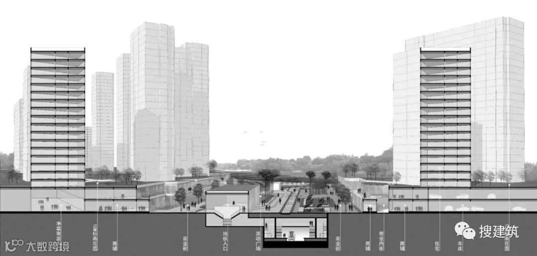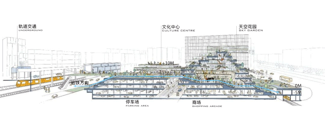 商业地块包含TOD交通枢纽、5万㎡购物中心、创业空间等各种一站式工作、生活所需配套。将TOD与垂直商业空间结合,通过绿化景观,打造一个公众参与的渗透性公共空间,打破城市空间的单一功能设定,促进综合功能区的开发。