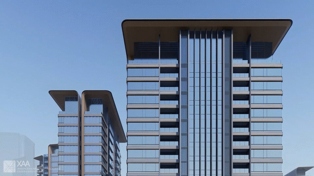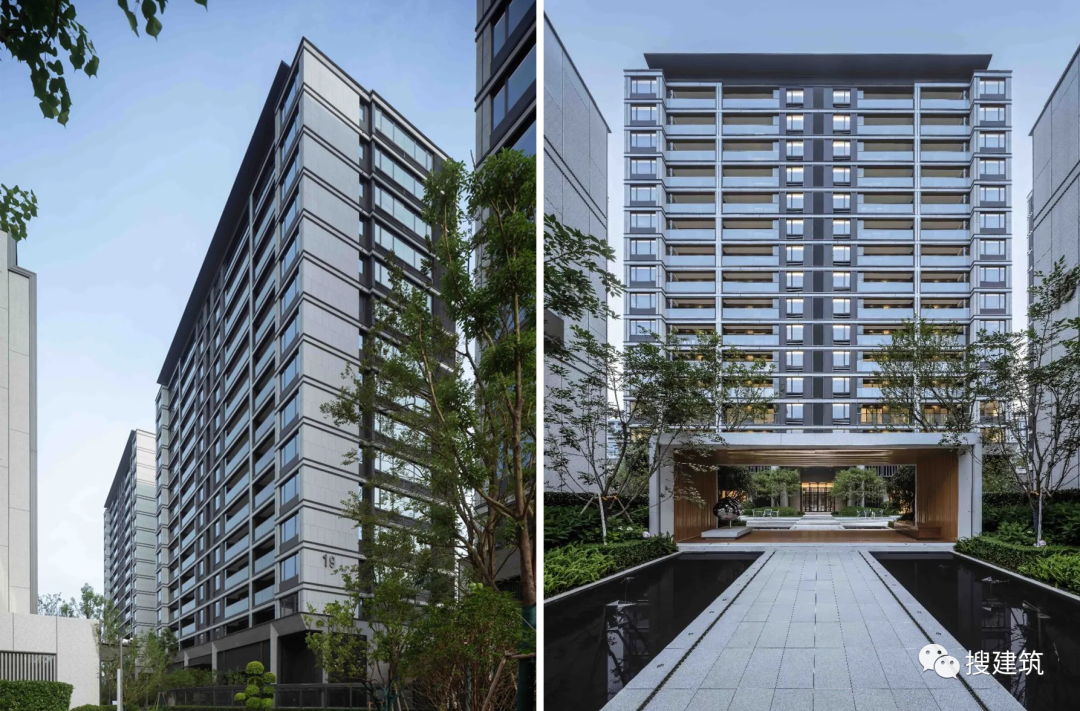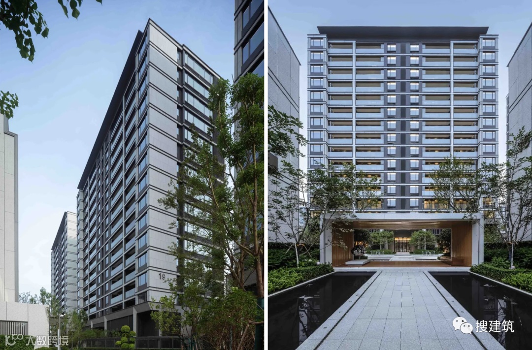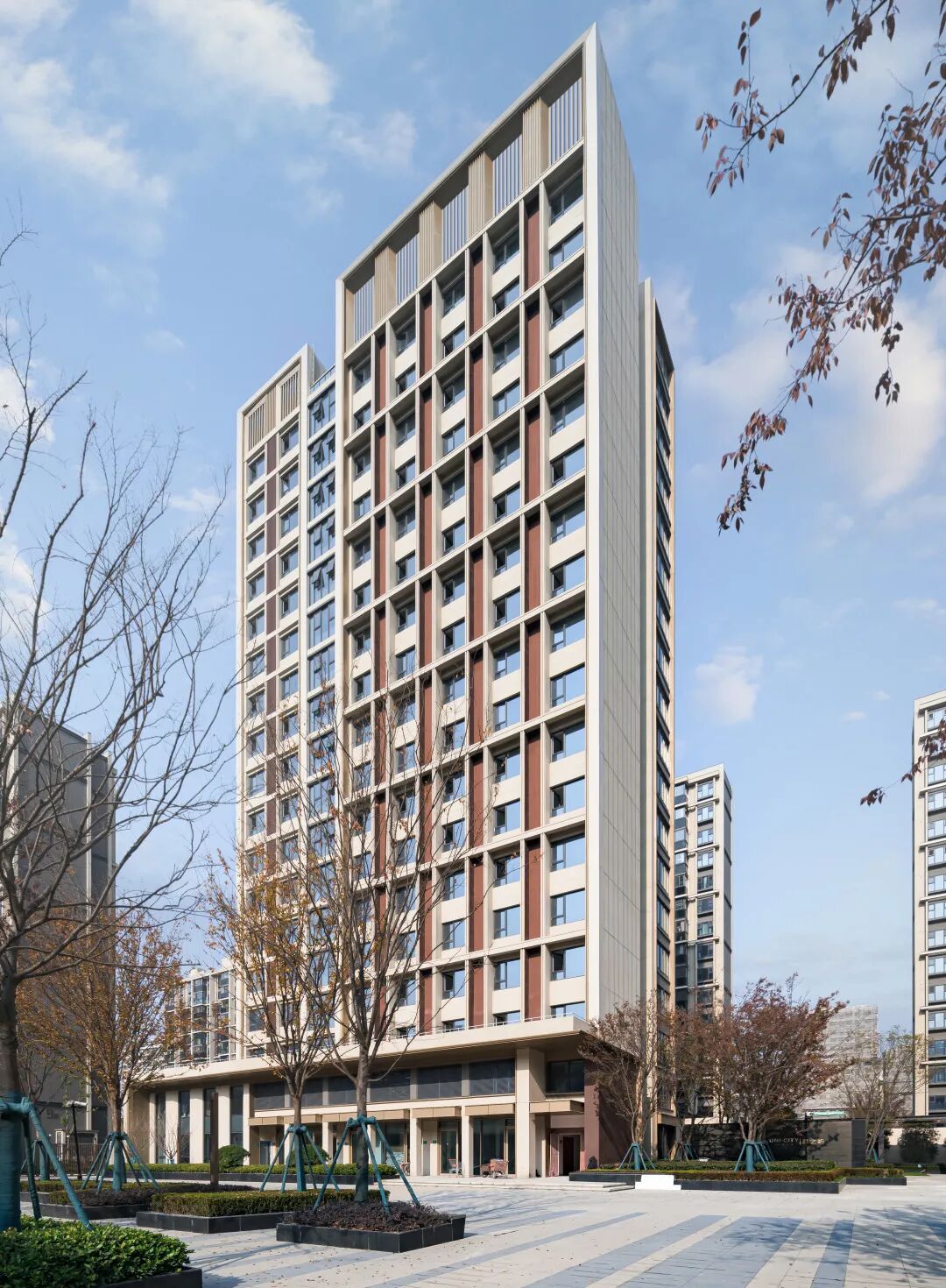 立面风格上延续了一期简洁素雅的现代审美,以竖向构件和水平构件的穿插关系形成有韵律的立面语言。