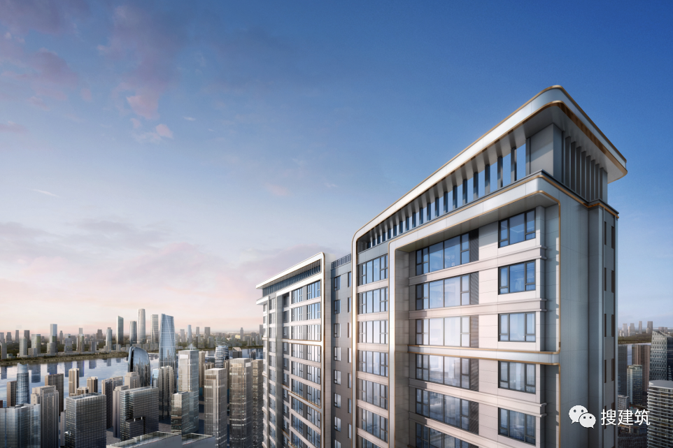 住宅组团外立面汲取现代极简主义理念,使用铝板立面+大玻璃幕墙打造现代极简立面。形态上,结合台州海洋文化,将传统的直角造型改为圆角造型,形成了兼具流线感和时尚感的外立面形态。