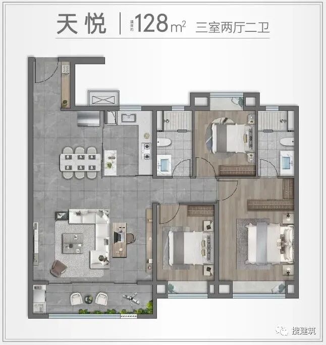 建面约128㎡户型,得房率居然高达82%!一上来就甩出南向6.6m的大方厅,近50㎡大LDK一体化设计,简直奢侈的要命!连接客厅和阳台的跑道式阳台,兼顾居家和休闲功能;客卫贴心设计到三分离式,靠近两间次卧,生活更加方便。