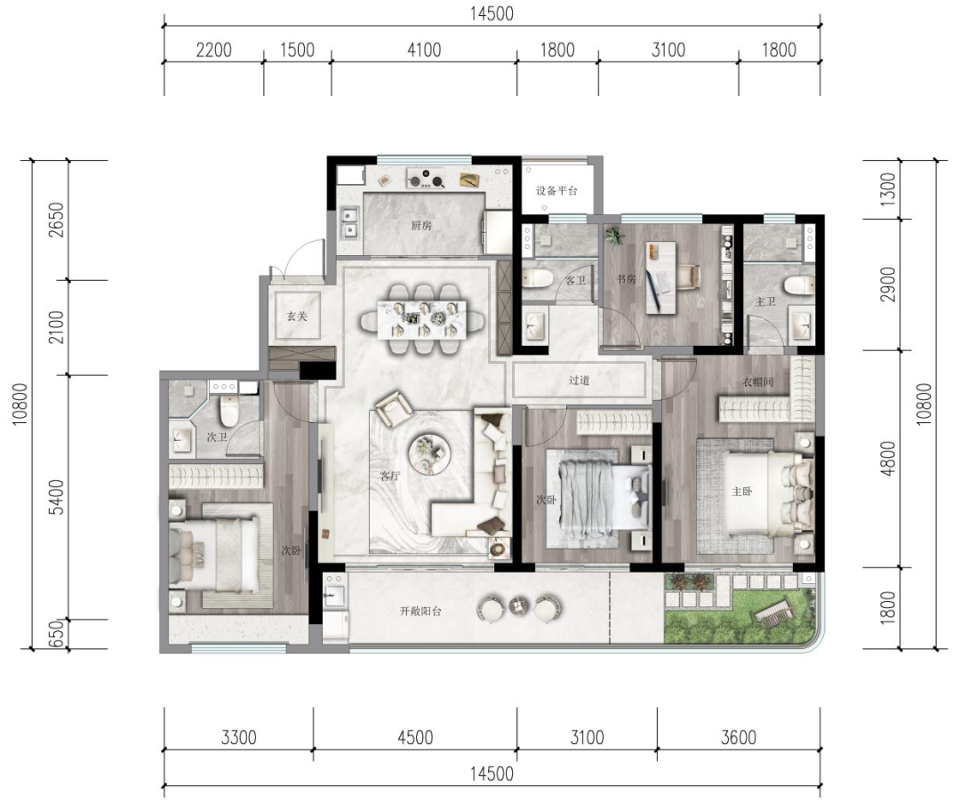 建面约115㎡户型设计方正,约14.5m面宽,南向4开间,独立客厅,横面U型厨房。舒居双套卧,主次卧皆配独立卫浴,静谧便捷,居住妙趣横生。