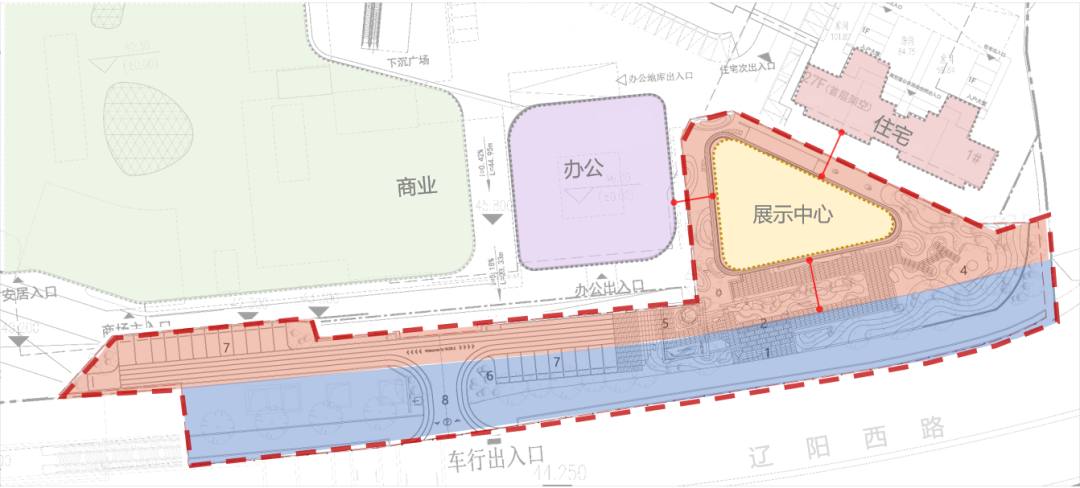 本案的展示中心位于地块东南角,南侧紧沿辽阳西路,北侧和西侧是同地块内的住宅楼和办公楼。整个展示中心场地拥有宽阔的沿街界面,但受周围建筑及南侧道路红线影响,可用区域较为紧凑,形状呈三角形。在满足功能需求的前提下,以控制线为基础进行倒角,形成相对柔和的形体,同时在入口处做出挑处理,实现建筑内外空间的平稳过渡。