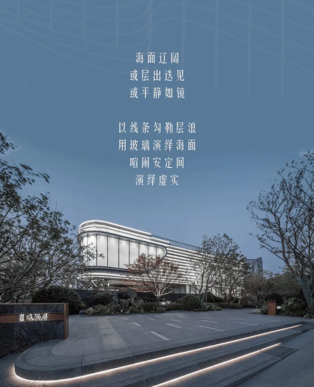随着社会意识水平的提升,人们对于美学的思考愈加返璞归真,偏爱于简单、自然、真实的美学感受,同时科学技术的进步改善了材料自身的特性,高品质材料增强了建筑的可阅读性,人们将建筑欣赏视角转移至建筑本身的形体韵律和材料品质。设计师们也致力于从理性出发,合理选用建筑材料,打造空间组成及造型美感相协调的立面形象。展示中心作为独特的设计类别,前期承担着展示楼盘品质、吸引客户关注的作用,后期往往会被改造成社区的公共使用空间,将会长期存在于社区中,如何凭借简洁的设计语汇生成不以时间更替而转移的美学感受逐渐成为了设计师思考的重点。
