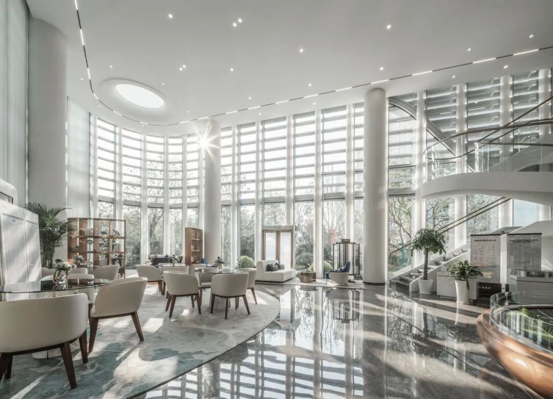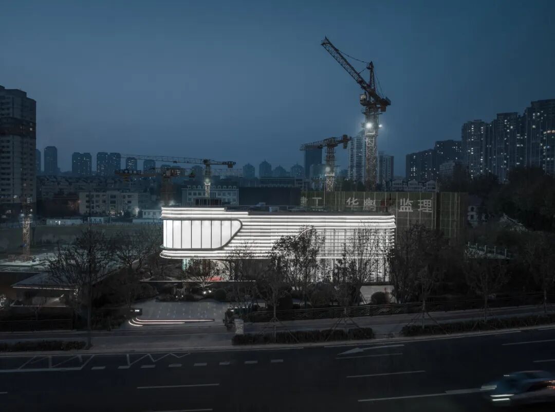 展示中心的功能分区较为明确,可划分为展示区和后勤区,从空间界面来看,展示区界面要比后勤区界面更为明亮、通透,高透玻璃无形中弱化了室内外分隔,外立面的横向构件也不会遮挡那一缕晨光,当阳光洒满室内,整个空间显得格外轻盈舒展。