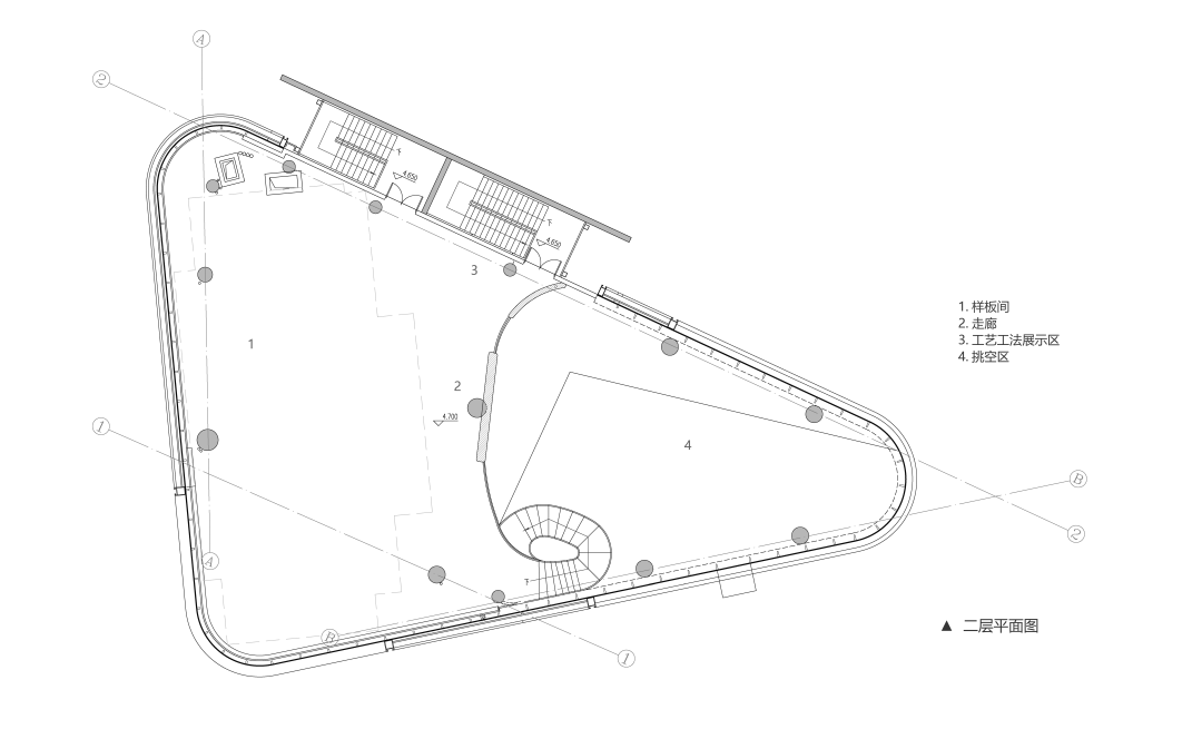 建筑内部空间可划分为首层的办公区、二层的样板间及两层挑空的展示洽谈空间。反映到立面设计上,挑空的展示洽谈空间是对开放性要求最高的区域,办公区次之,而样板间则需要进行遮蔽处理,由此得到立面虚实关系划分。