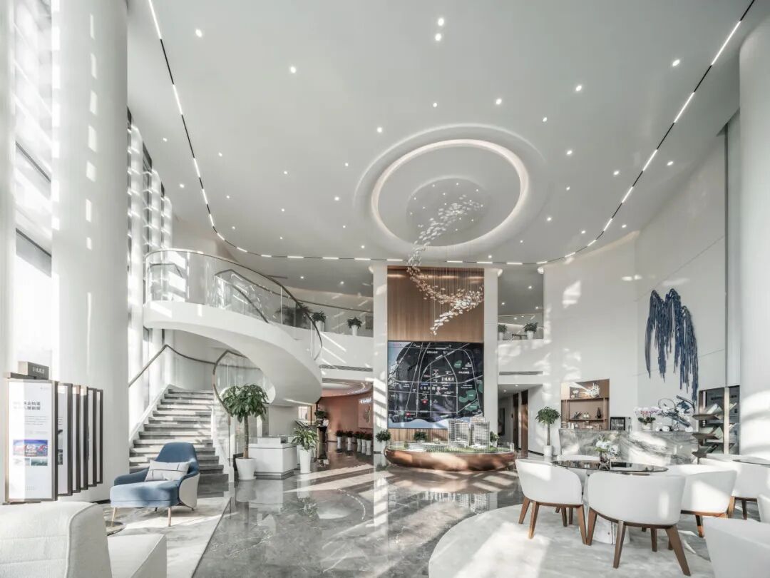 室内空间的设计围绕着挑空区进行,整体空间以白色为主色系,深灰、墨蓝、暗金等点缀其中,雅致的色系搭配提升了空间整体格调,简洁雅致的空间形象传递出包容与平等的人文理念。
