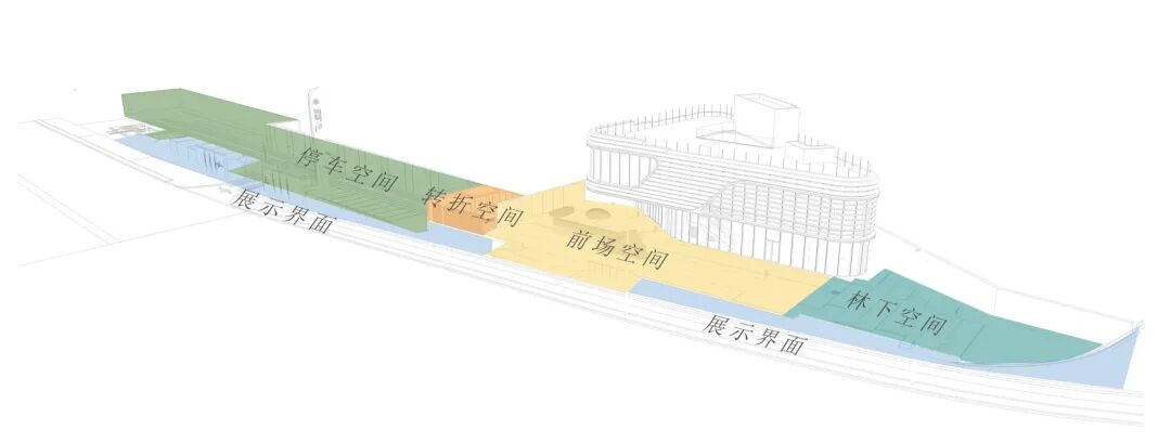 对整个展示中心场地进行合理分区之前,充分利用宽阔的沿街展面,增强沿街品质感和昭示性。在场地内部,采用欲扬先抑的手法打造多重转折空间,延长体验线路,增强空间递进关系,同时利用场地东侧地势高差,打造建筑与植物的围合空间,衍生自然的气息。