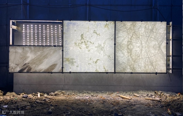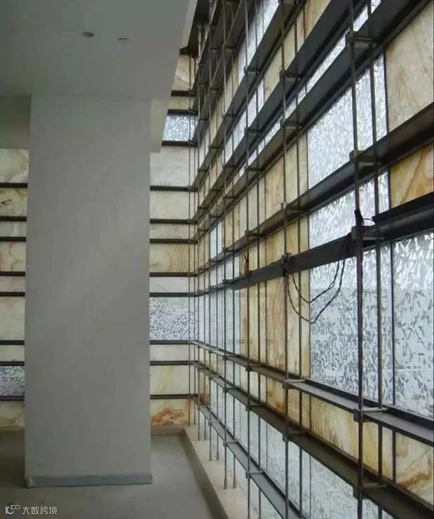 它同时具备强度大、耐候性能优异、抗紫外线、保持石材的天然纹理等特点,配合不同的灯光设计,可以产生非常独特的光影效果。纹样漂亮的一层单面的石材薄片与玻璃夹胶紧密的贴合在一起。