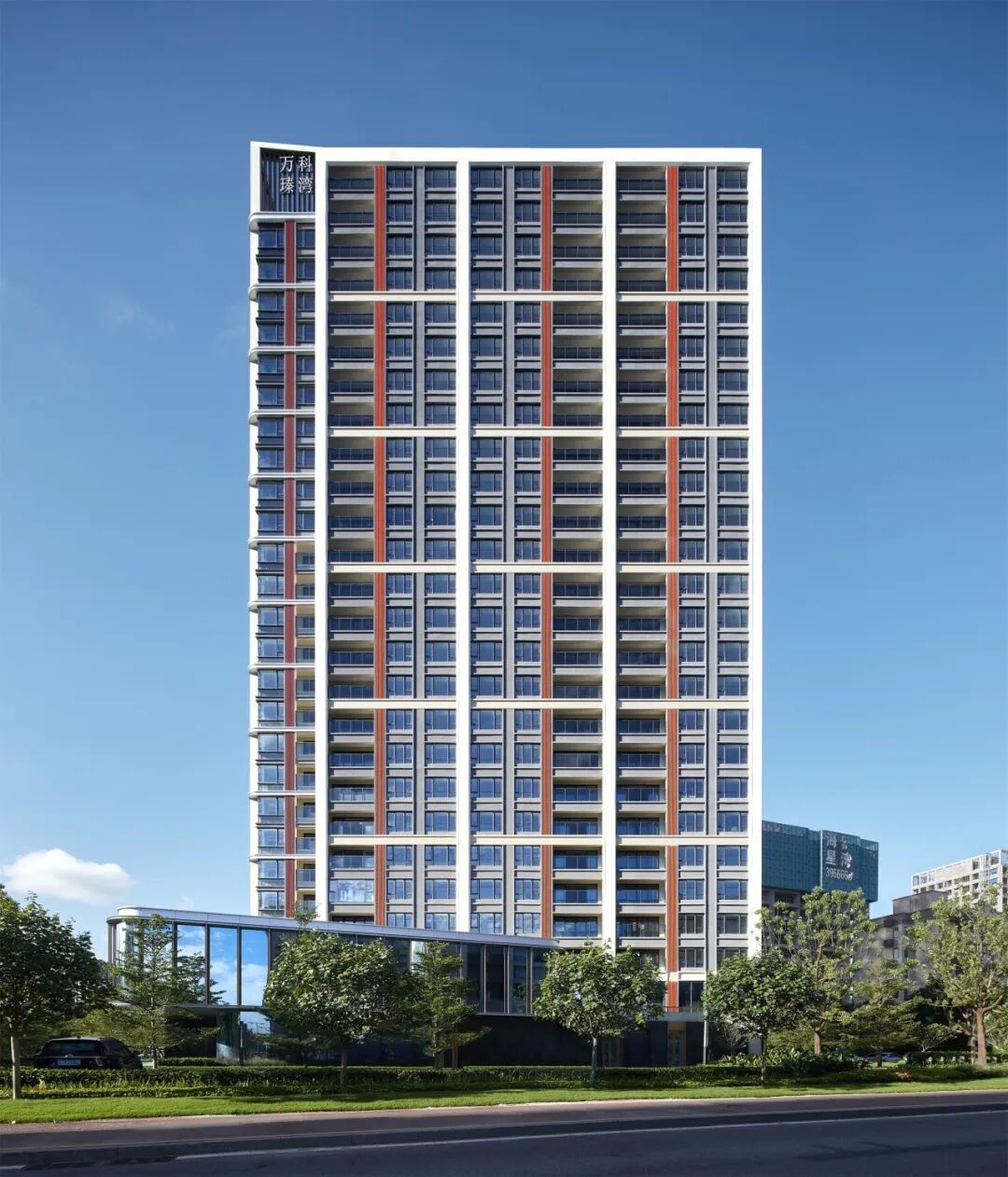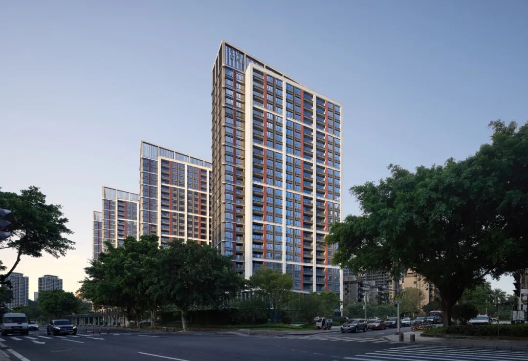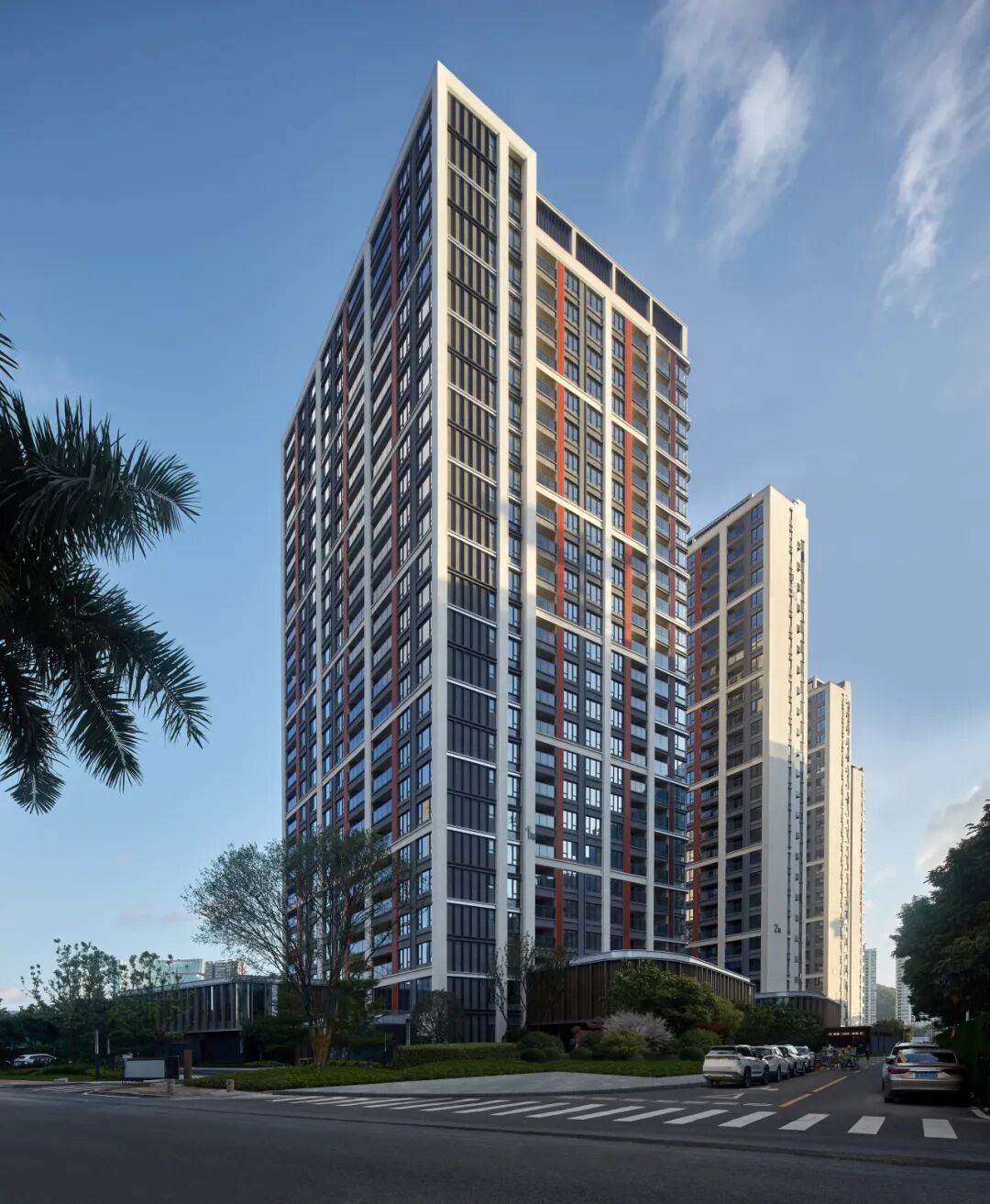 在住宅立面的设计上,我们选择延续社区整体的调性,以公建化模式、色彩交织的线条强调城市形象与标志感,由国际灰、中国红、炫彩橙和纳米白等颜色构成,呈现滨海城市的风情与活力氛围。