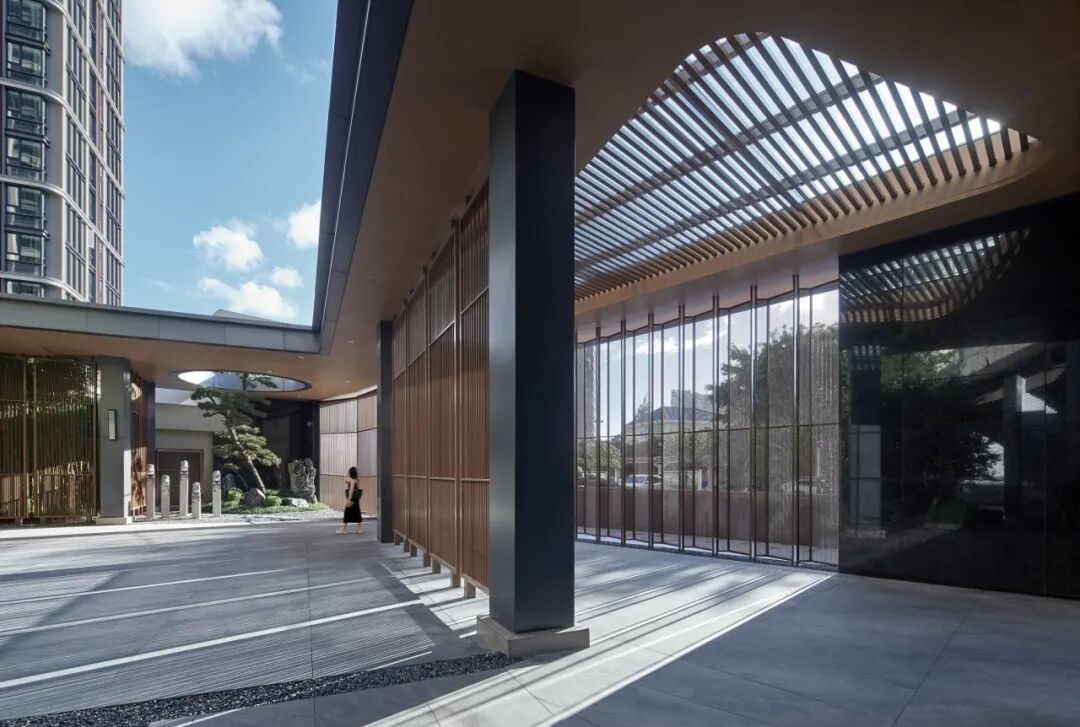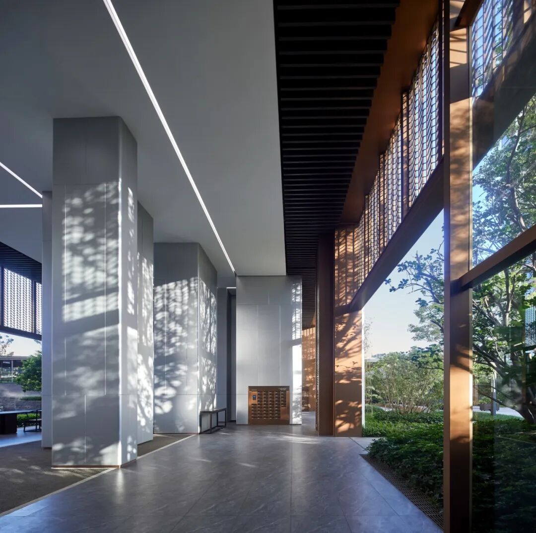 社区内部通过塔楼底部架空,悬挑了一个延续整个界面的风雨连廊,通过首层架空设置的泛大堂,进入社区内部,打造出沉浸式的酒店式归家体验。