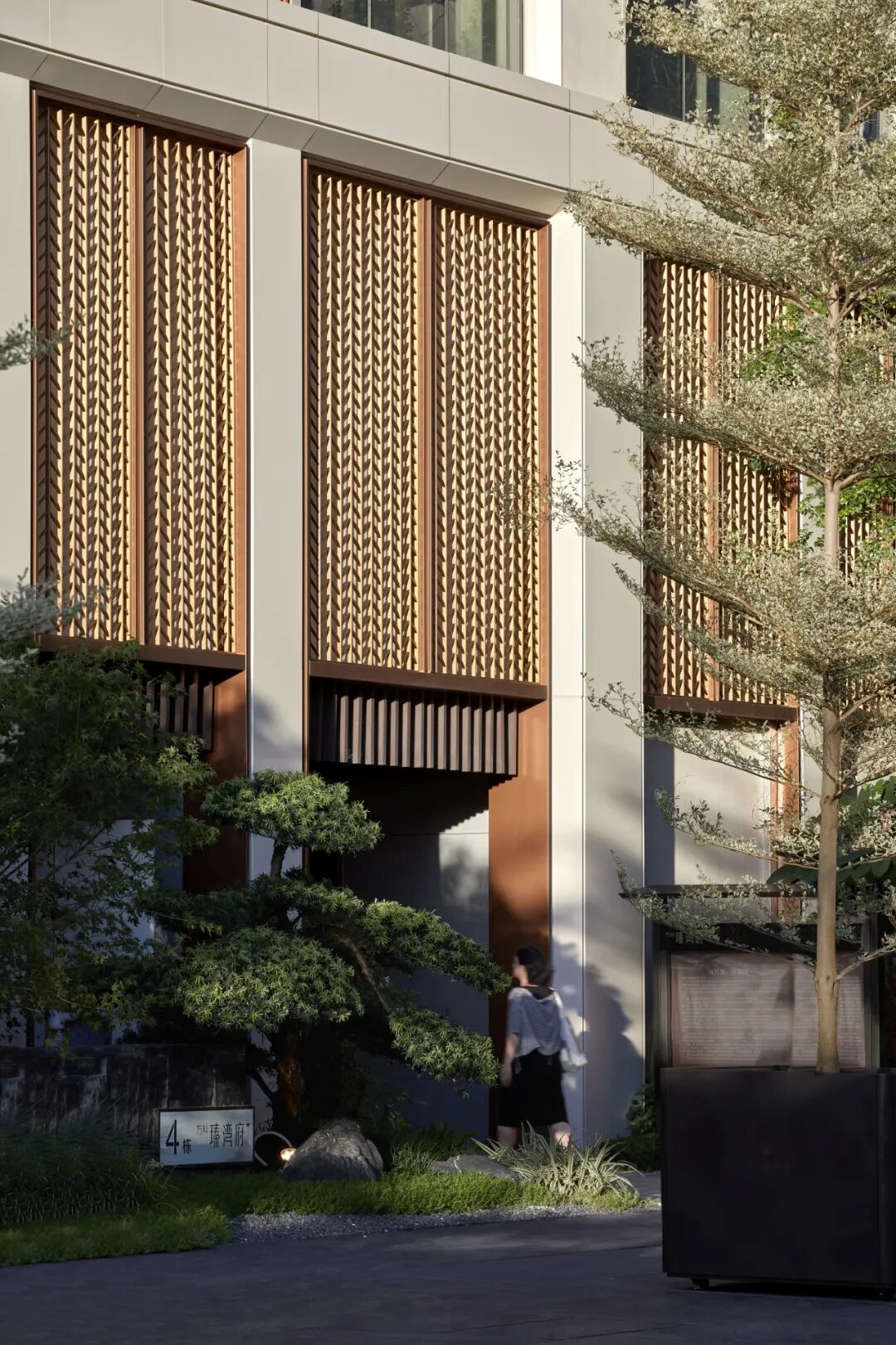 屋顶的设计上我们采用了最高点达8.35m长的金属格栅,顺势而下,形成标志性的斜向屋顶,带来了超强的识别度,既形成了[艺术豪宅]的认知,又创造出了城市里的[美学灯塔]。