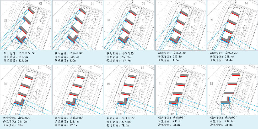 为平衡多方利益,我们对周边资源进行了极致研究,在前期进行了大量的实景勘测与视线分析。总图楼栋规划从正南北(0°)到海景朝向(44.5°)的角度尝试,最终找到最大海景观景面朝向(南片西40°),实现极致化的海景资源。