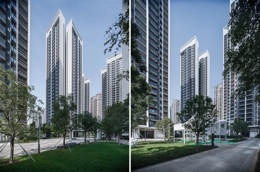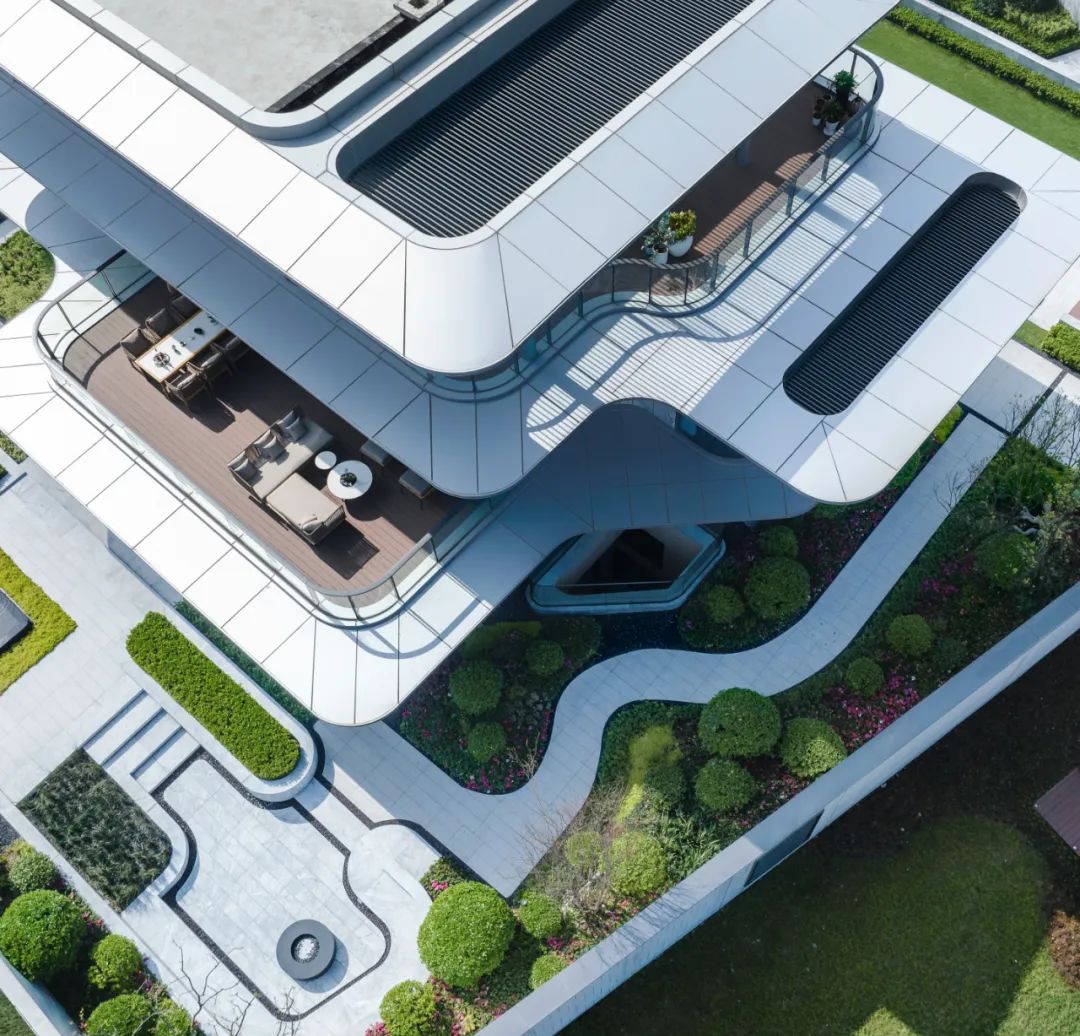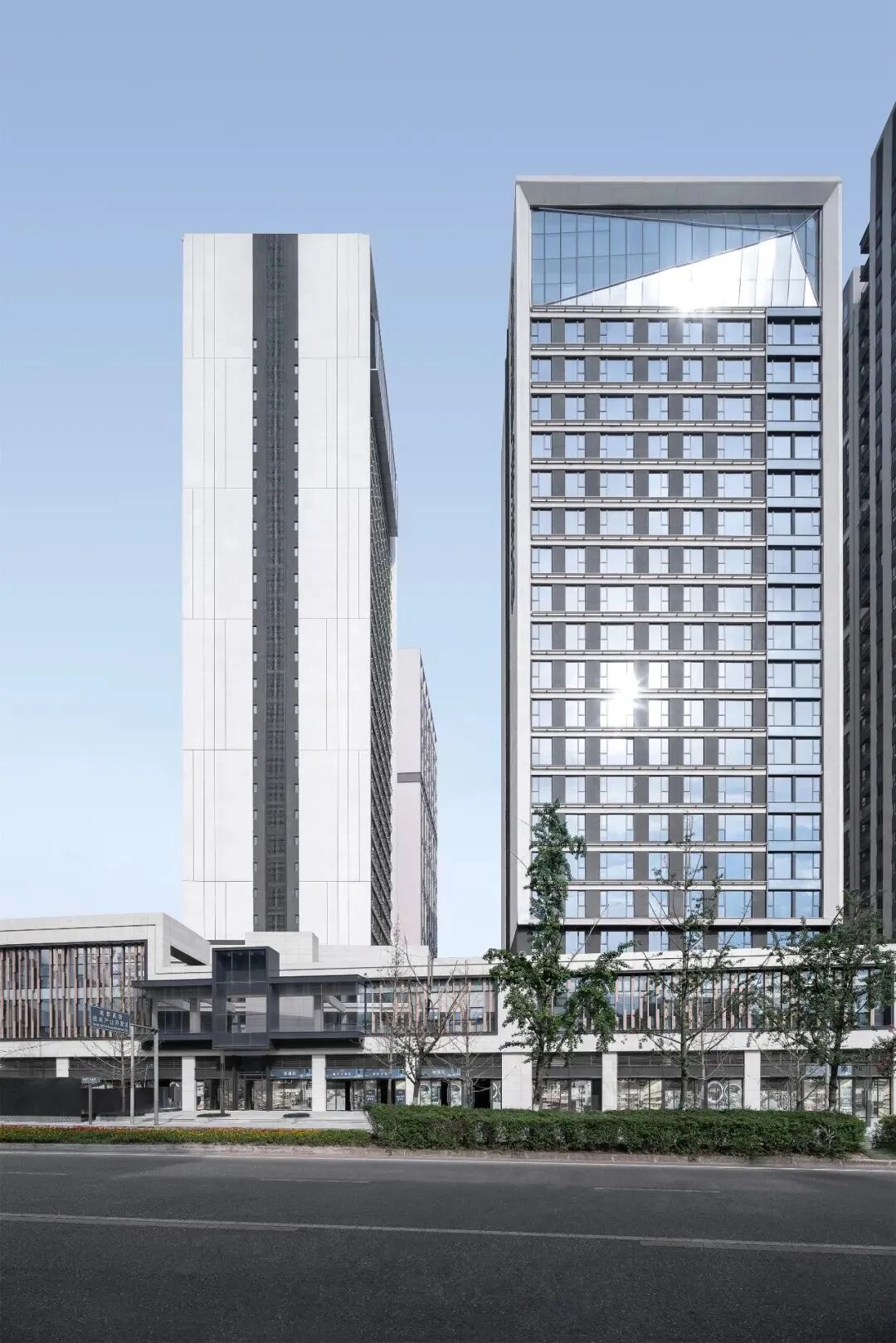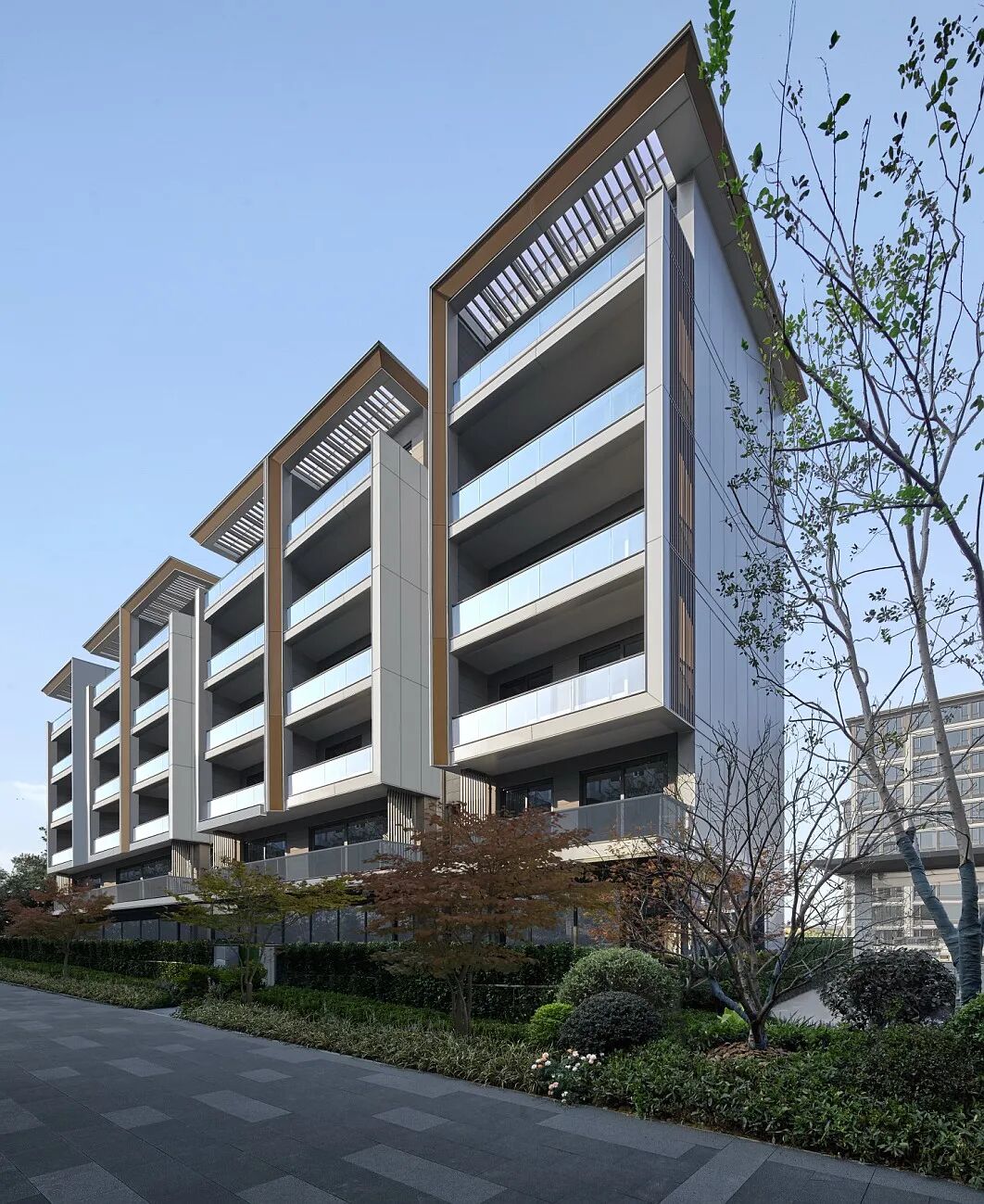 杭州仁恒置地∣香港置地·前湾国际社区住宅屋顶的穿孔铝板强调建筑的艺术感和方向性。