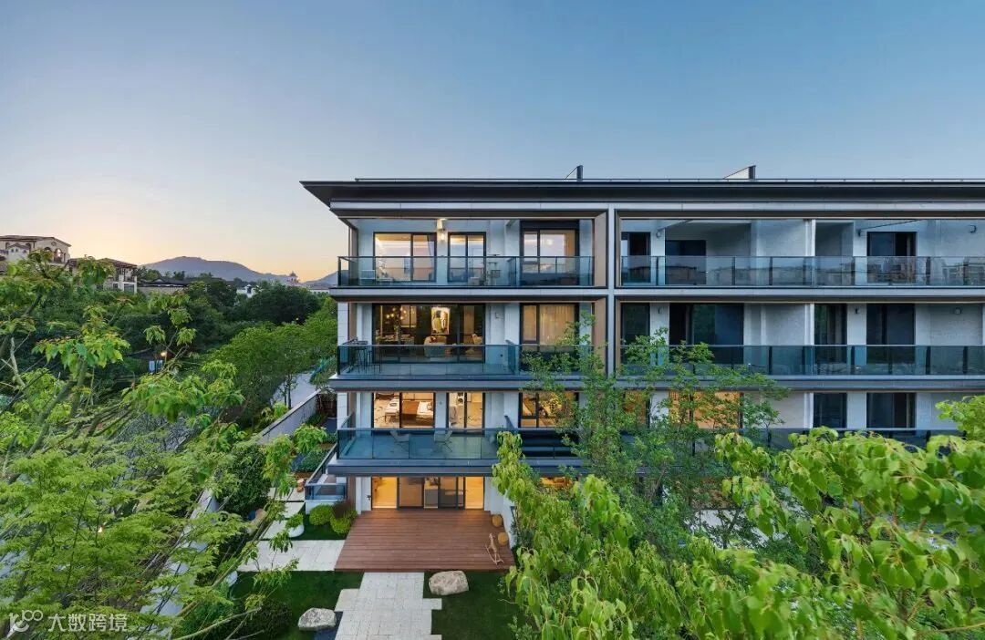杭州大华春山隐树院,极简的建筑线条,大面积的通透玻璃,配合“油画框”式的设计元素,完全是现代主义美学。