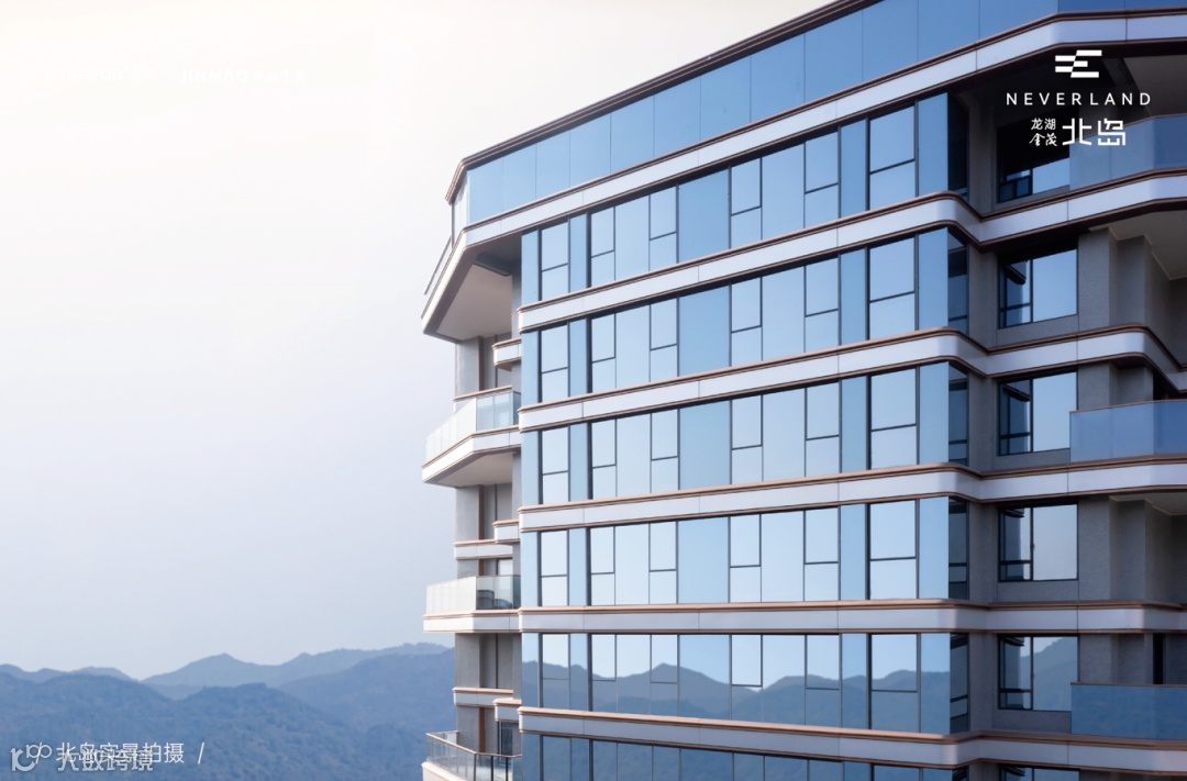 重庆龙湖金茂·北岛大量采用仿木纹铝板和通高玻璃幕墙构筑的归家空间立面,仿木纹色彩与自然更为亲近,通高的玻璃幕墙则让建筑更具现代感。