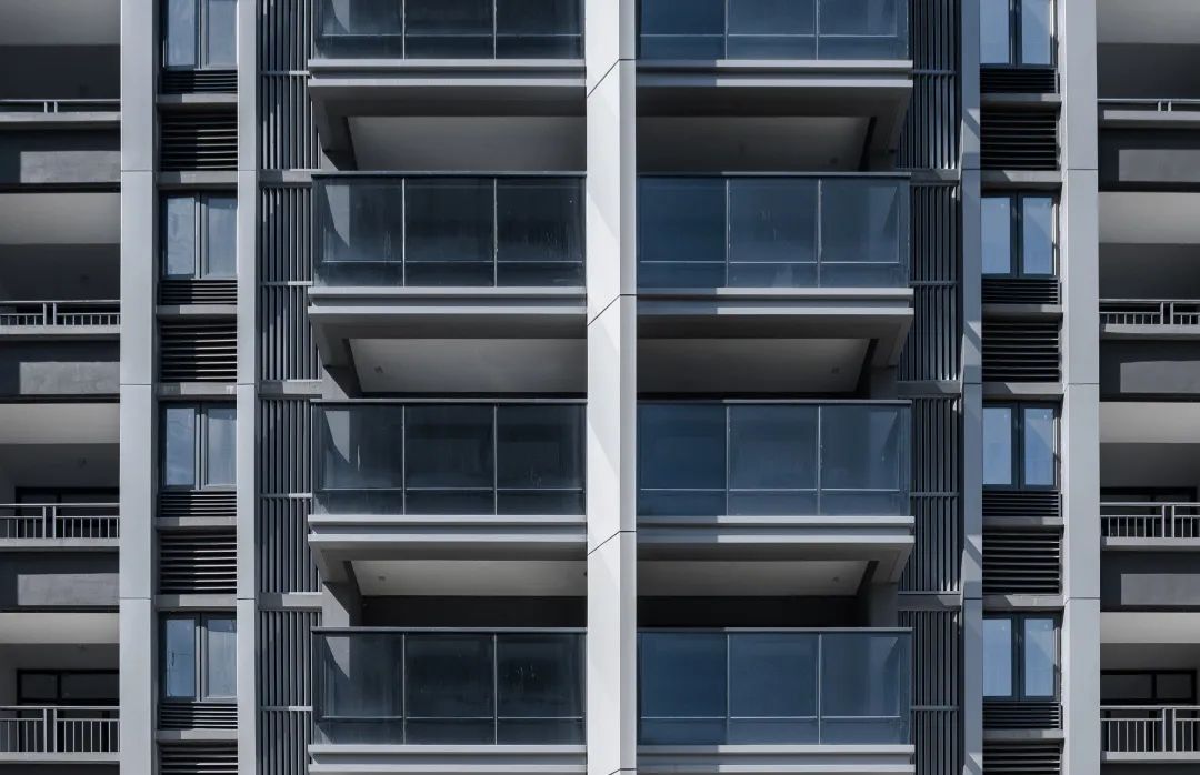 润达丰控股 滨江·天樾建筑侧面采用米黄色真石漆与深灰色涂料和深灰色穿孔铝板结合,虚与实的对比将建筑映衬得干净、纯粹而又轻盈。