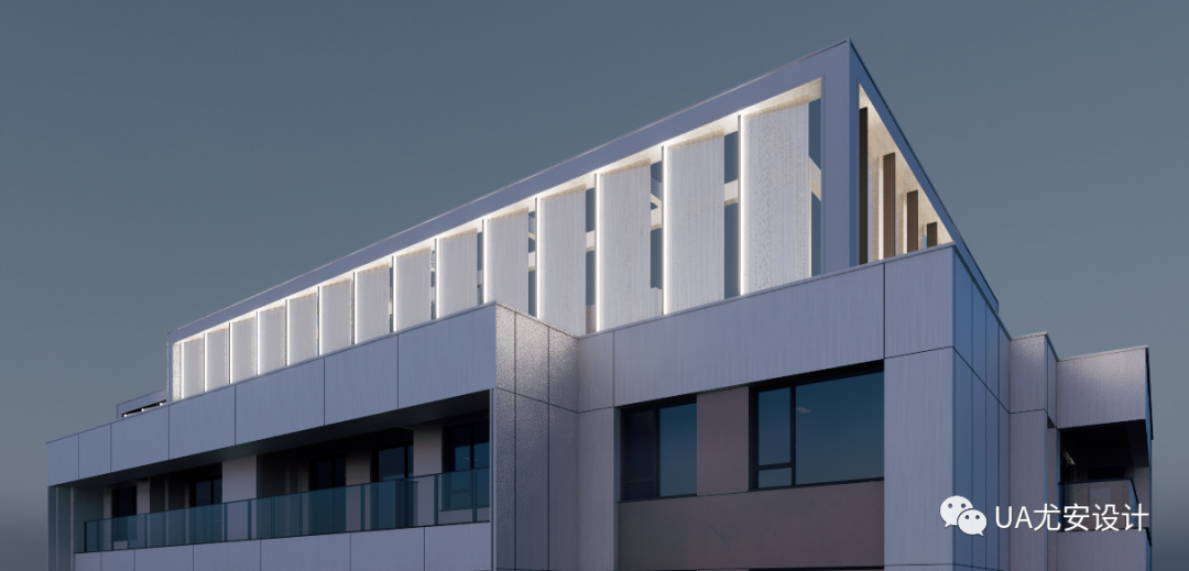 其次优化建筑第五立面,增加顶部穿孔铝板增强建筑挺拔感;最后在人视角度上,使用大面浅色金属铝板+深色金属压边的形式,减少人视角度建筑带来的厚重感,同时丰富山墙面等可视面的细节。