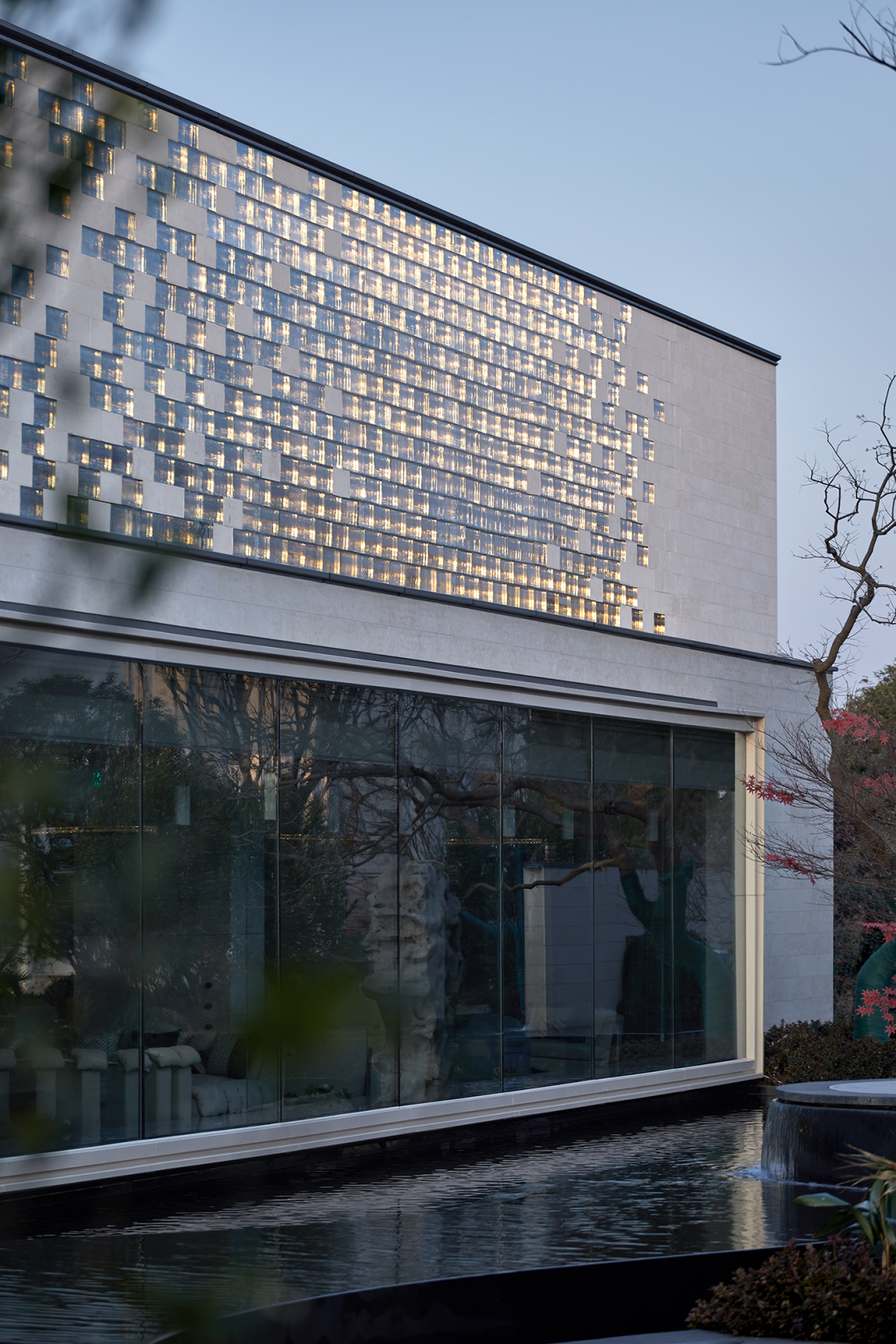 空间遍布水景,模糊室内外的界限,嵌套琉璃盒子,打造江南园林的“空间转合”。