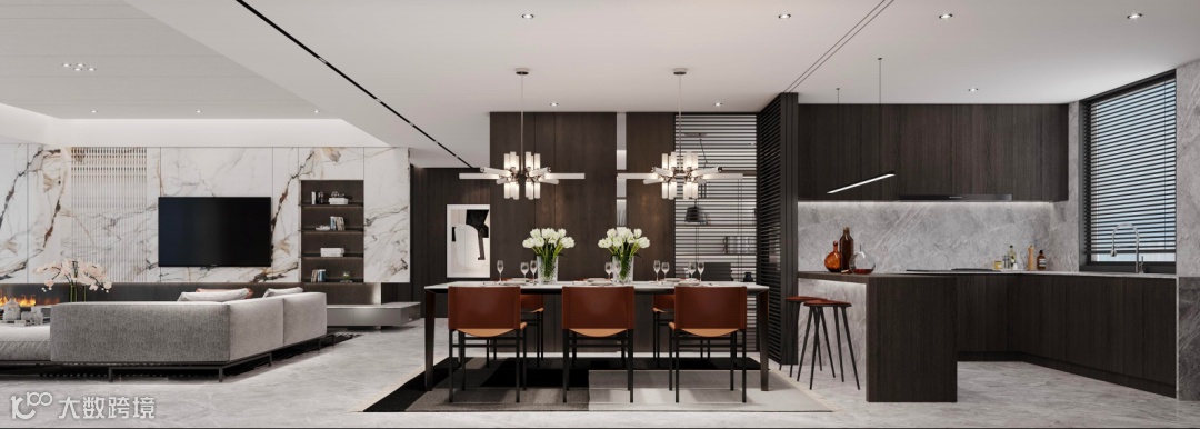 LDK客餐厅一体化整体约70㎡,客厅无主灯设计,双背景板交付,空间奢阔,一体化设计,与餐厨连通,轻松拉近家人的距离,让家人们的欢聚不止一种形式。