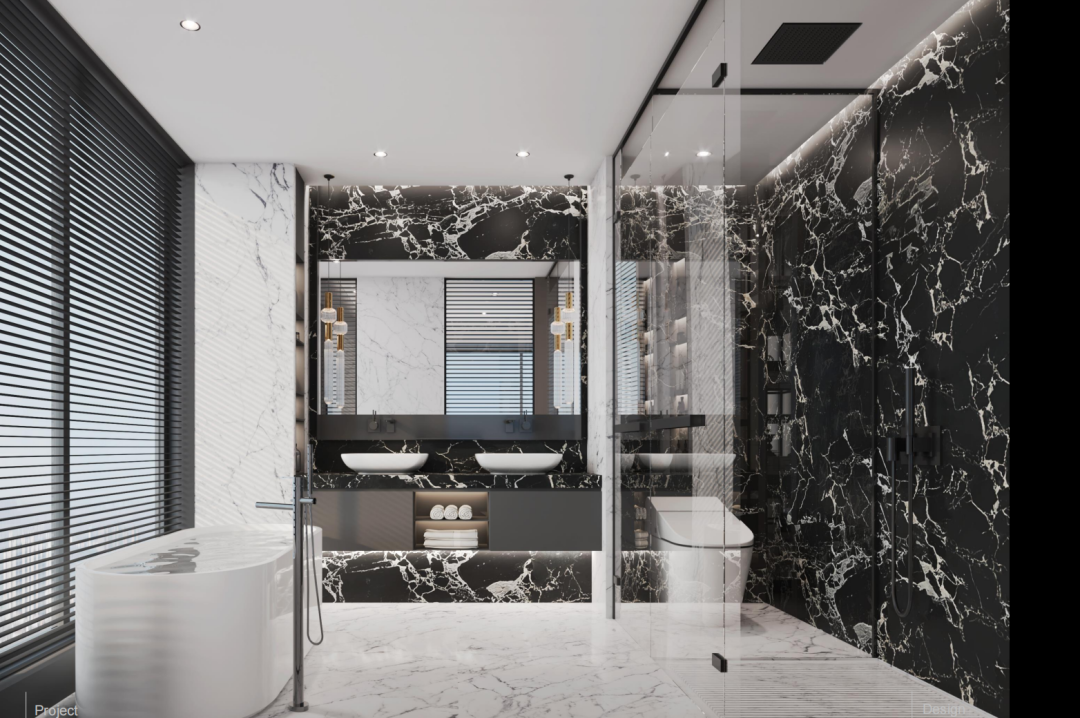 地面采用简一的无缝拼接技术;交付的橱柜门是鎏金色的铜制品、大理石的台面、连水槽都是石英石打磨而成。油烟机、燃气灶、洗碗机品牌均为德国嘉格纳,这三套市场价超十几万,在南京也只有少数豪宅楼盘才会用。