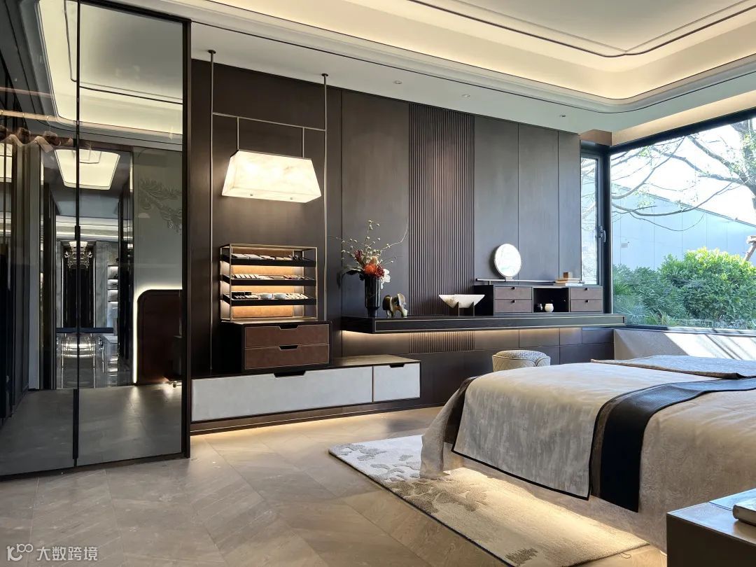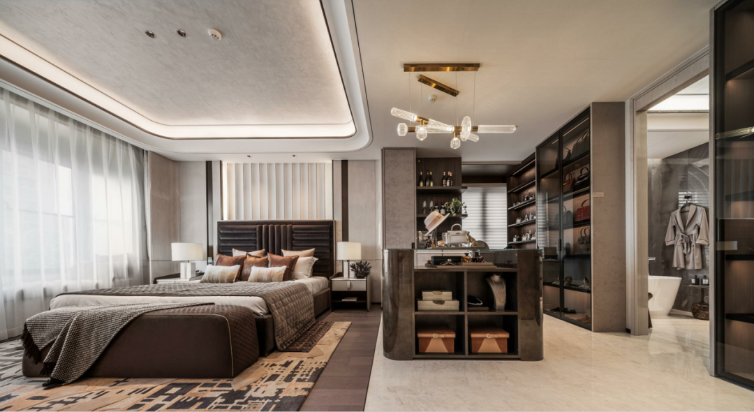 更赞的是,做了双主套设计,特别是豪华主卧套房,独立衣帽间和行政书房,带来五星级酒店的同款享受;长辈套房直接做到270°折叠屏飘窗,在房间内转一圈,每个角度都是最佳景观位。
