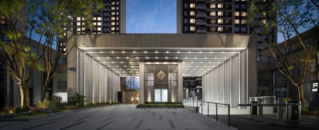 成都万科·公园传奇大门人行和车行入口由一个质感岗亭分隔,入口设计采用酒店式门头,以硬朗的金属质感,彰显轻奢品质。
