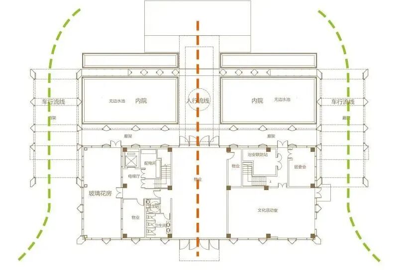 此种形式强调人行通道的品质感。当人行道路居中时,就为做一个漂亮的门头或者大气的岗亭创造了条件,配合上景观绿化和铺装,可以使小区入口体现出高档社区的风貌,且由于两侧的车行通道还可采用进出分离的设计,小区内部也更容易实现人车分流。