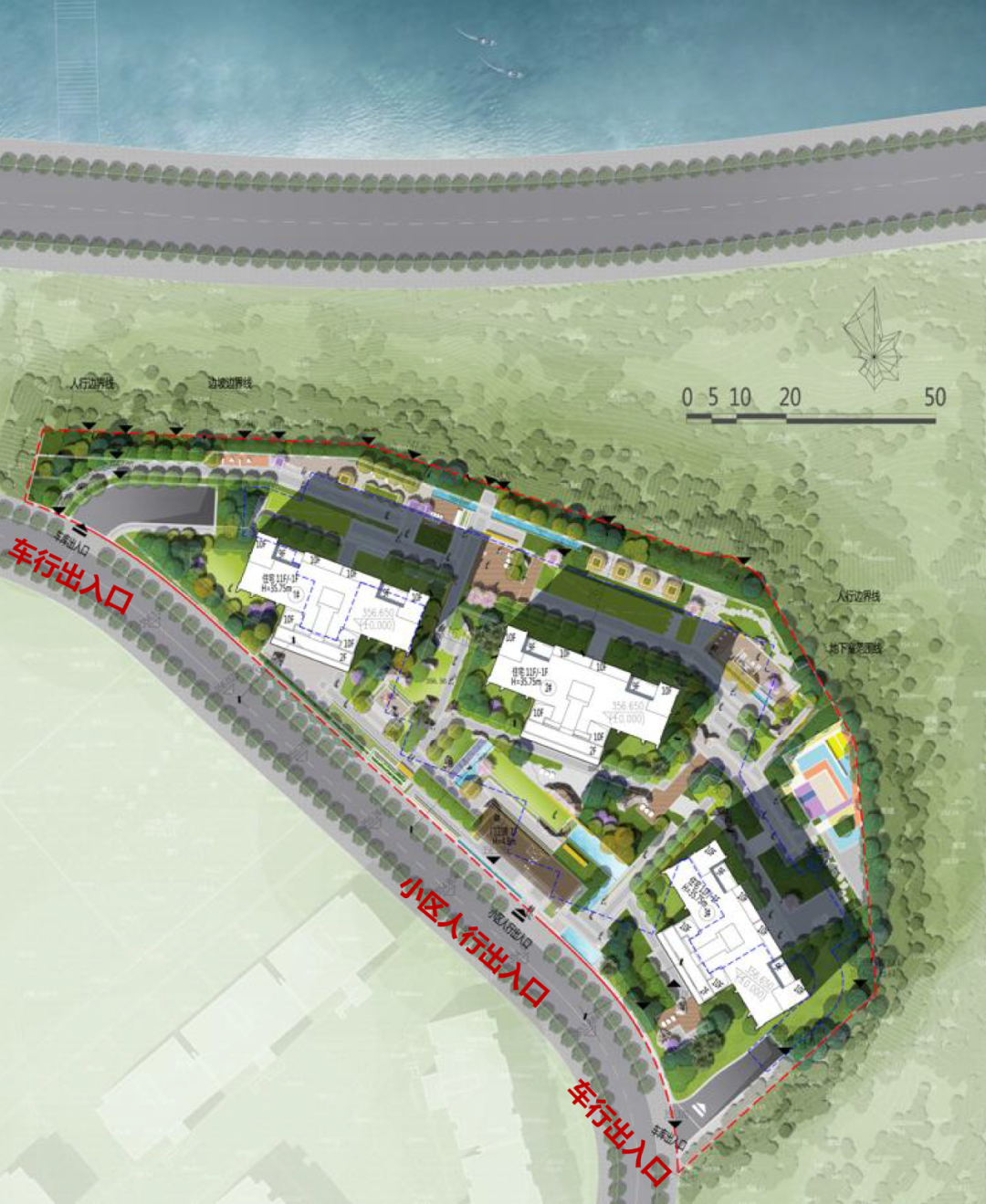 入口设计应根据住宅小区的规模、组织交通等实际情况,设置规模适宜、数量合理的住宅小区入口,并且遵循人流、车流的具体情况,合理分配各个功能分区的尺度和规模。