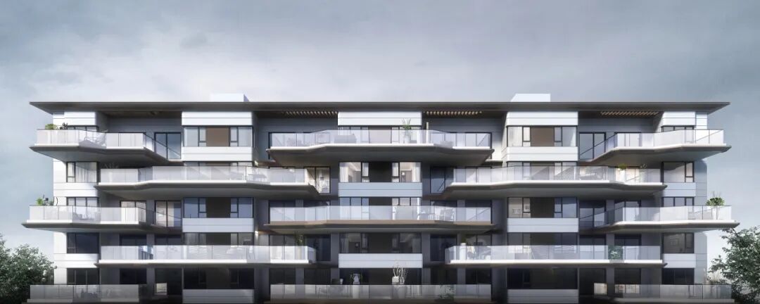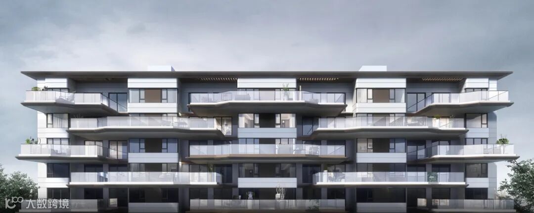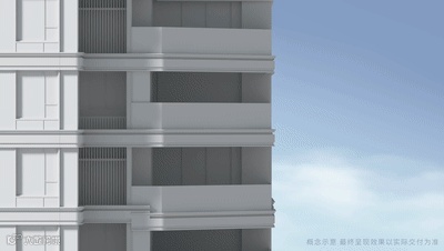 错层阳台的设计从视觉上拉大层高,蜿蜒流畅的立面曲线,营造出波浪一般的动感立体效果。加之大面积的玻璃带来很强的通透性,搭配蓝灰色的玻璃栏板,勾勒和凸显洋房的整体线条之美,营造出不一样的高级感。