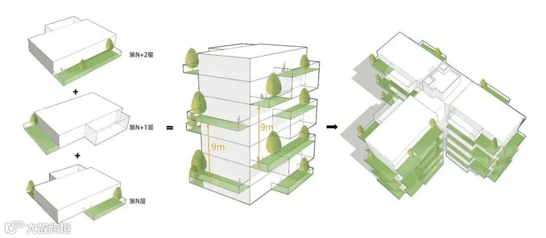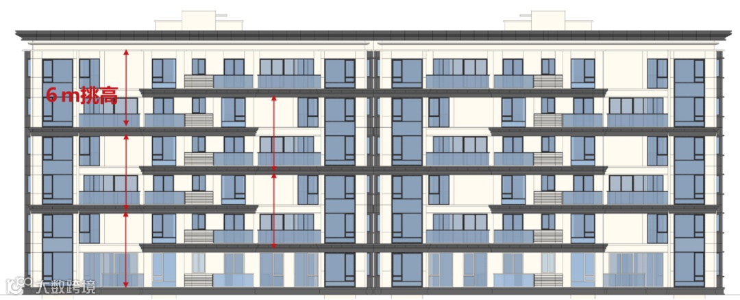 通过设置错层局部挑空方式设置阳台形式,改善采光和通风条件,优化室外活动空间,丰富城市建筑层次和造型,提升环境体验。