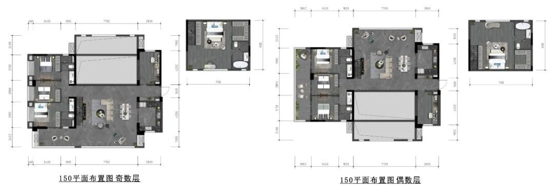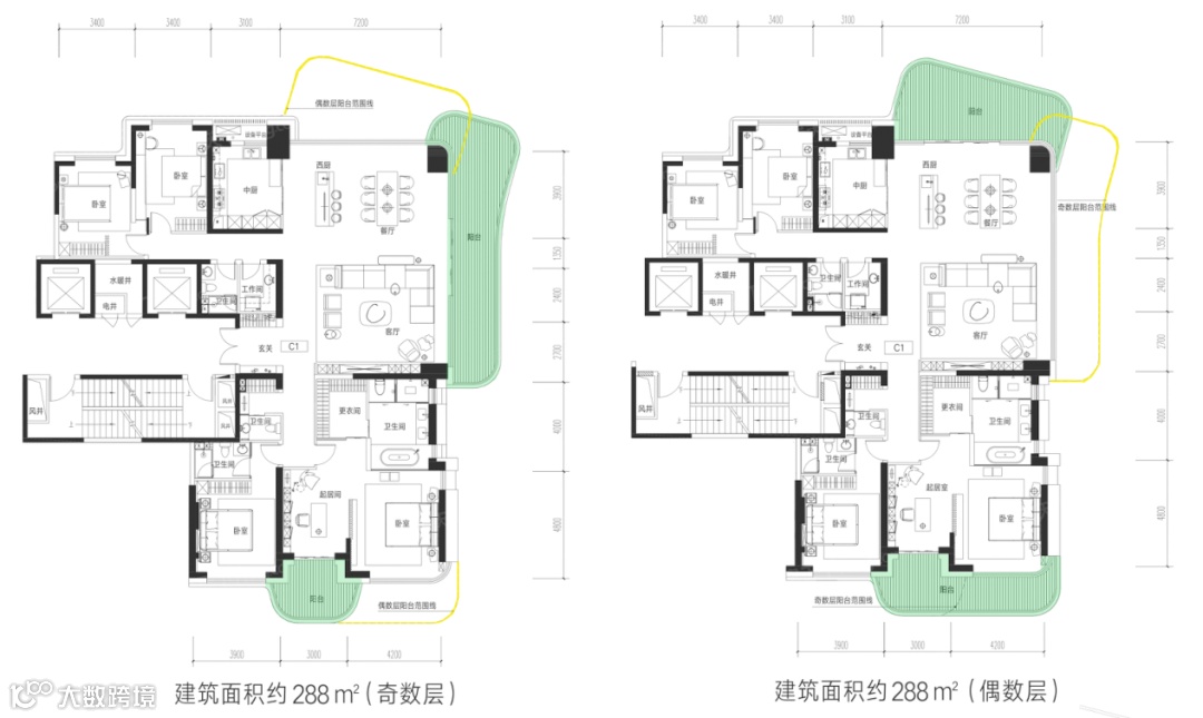 同样是建面约288㎡的奇数层和偶数层户型,其最大的区别在于阳台的位置。