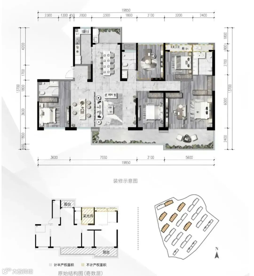 未来天奕,整体布局共5栋楼,主力户型是建面约218㎡和288㎡的四房。