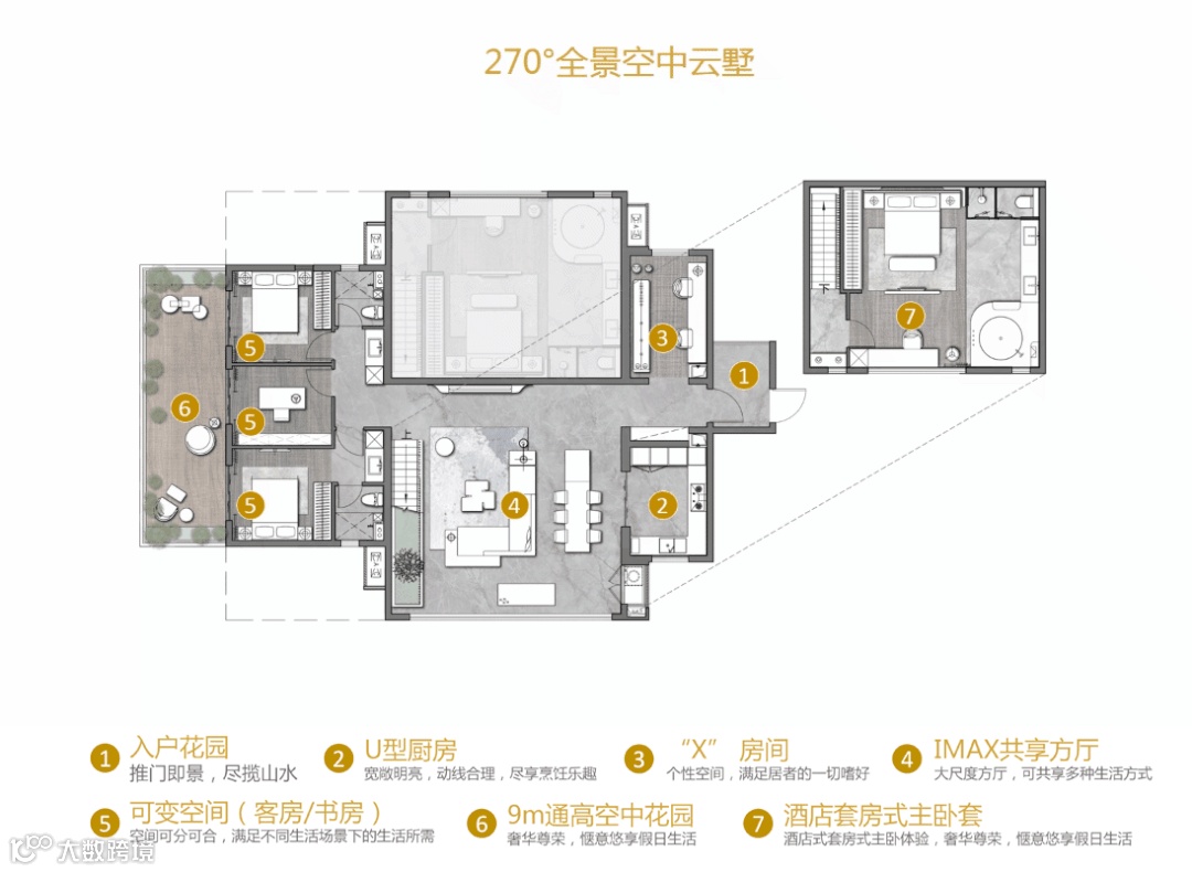 产品通过错层设置阳台的方式,打造了一个9米通高、270°环幕视野的空中庭院,将本属于地面的院落景致移植到空中,让大平层产品亦可拥有自己的庭院,切实地构筑了一方“空中云墅”。