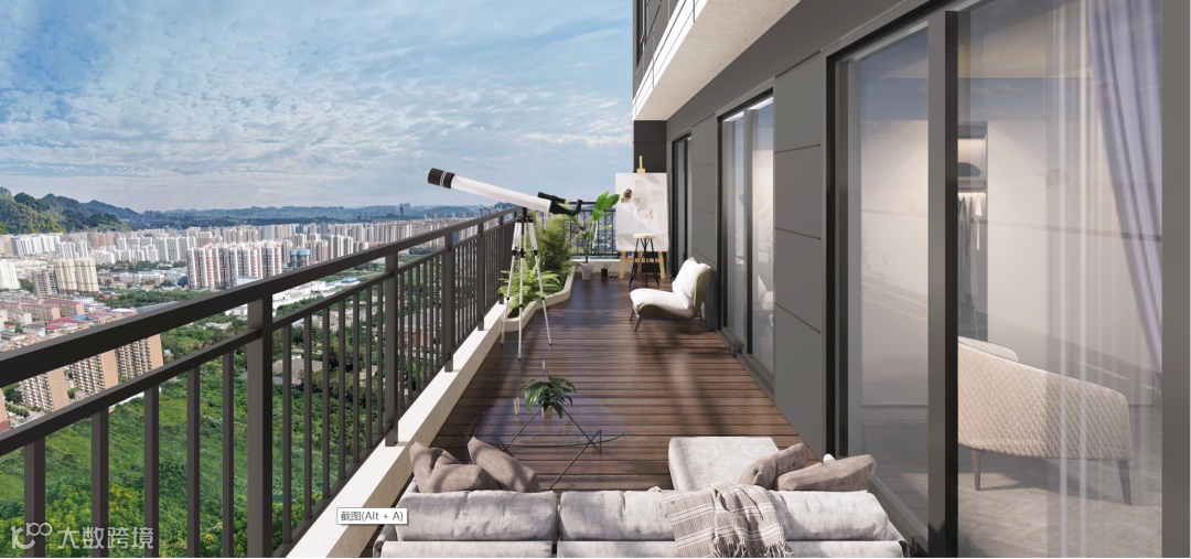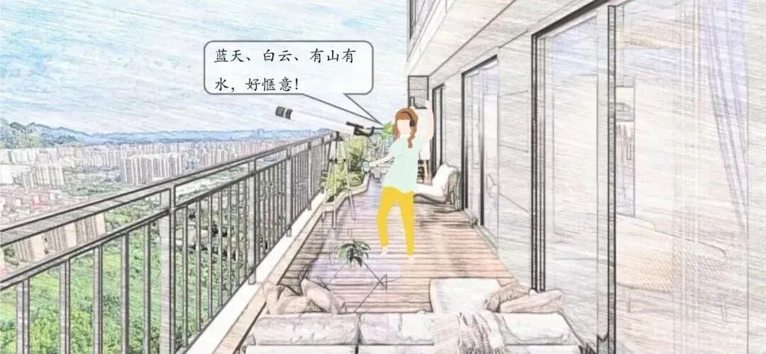 通过创新错层阳台布局,打造了一个约6米双层挑空、270°观景“云端私宅”,把本属于地面的院落,移到了空中,构一方“空中庭院”,让人真正拥抱天空。