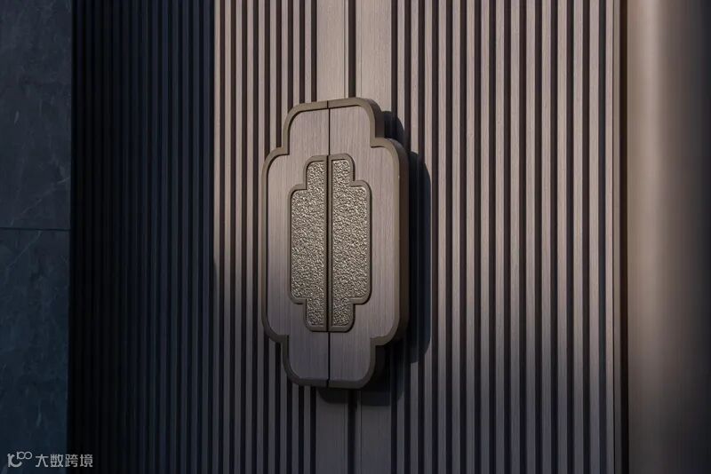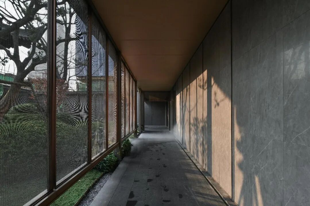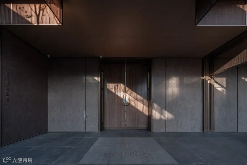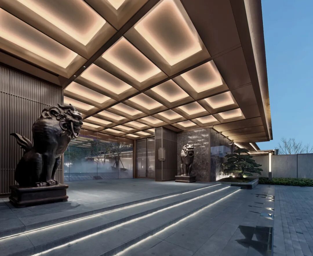 为了展示现代中式美学,立面设计除了第五立面的设计,还注重人视角度第六立面(室外吊顶)的打造。门堂中心区域的吊顶来自宋代大格平棊天花,经现代演绎后,线条利落的大方格结合暗敷的灯带,打造尊崇门庭空间,归家礼仪感拉满。其余位置采用折槽木纹铝板及型材收边的吊顶形式,充分发挥现代材料及工艺之美。