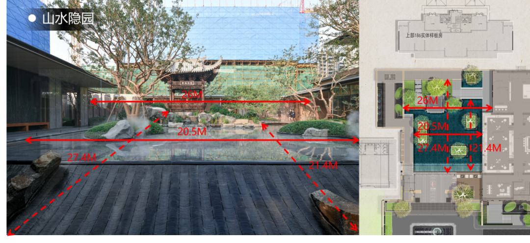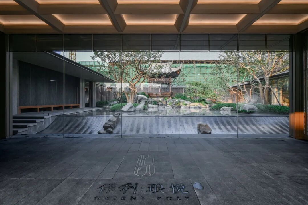 千年前西园楼阁与水池的关系在西园主人王诜的笔下化作“金翠楼台,倒影芙蓉沼”,而今琅悦,则是宋风售楼处与中式山水隐园的对话:为呈现一副巨幕山水画,以12*3.55m(国内玻璃原片尺寸限高3.55m)的巨幅玻璃筑造无界交融的建筑园林关系。