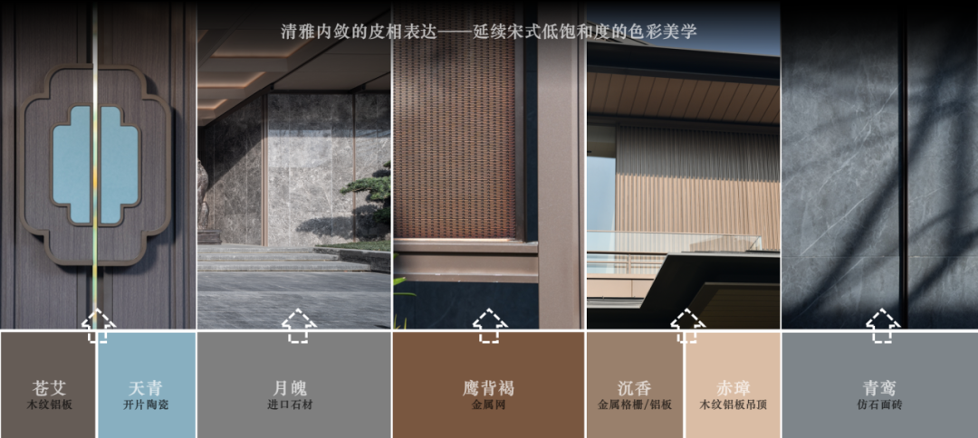 在配色上,为了还原宋风雅韵,设计团队通过研究大量宋画,总结出宋风低饱和度的色彩美学,提炼出苍艾、天青、月魄、沉香、赤璋等中式传统色彩并运用到铝板、陶瓷、石材等材质中。整个示范区建筑以月魄灰与沉香棕为主色调,天青作为点缀色,整体呈现一种清雅内敛的文人气息,这在南昌是独一份。