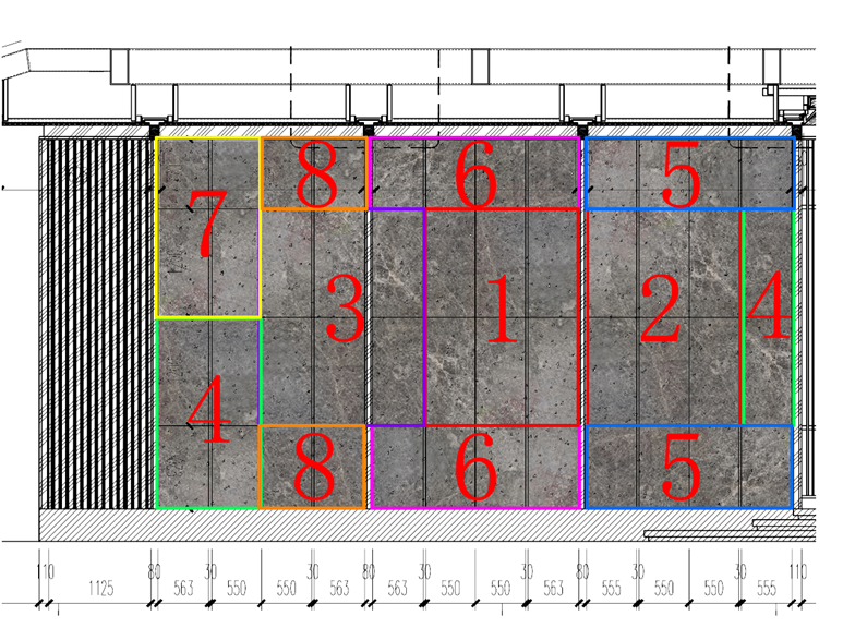 石材纹理特殊,为避免走样,奔赴产地挑选合适的石材原片,电脑初步排版,确认每块石材的划分及分布。