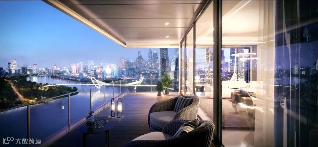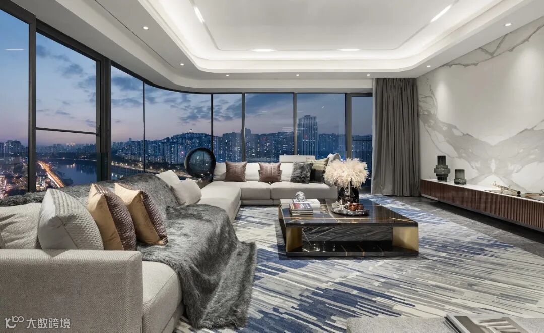 取消了过往客厅和阳台间的那道滑门,让客厅和阳台连成了一片,一个尺寸达到13.5X10米、使用面积达到135平米、两面落地玻璃270度采光、正看两江交汇的会客厅,是一种什么样的气场?
