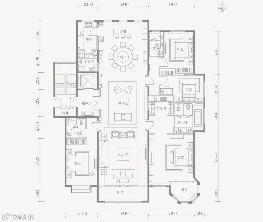 龙盛•福新里约307平方米四房两厅五卫户型,格局方正,南北通透,动线清晰。