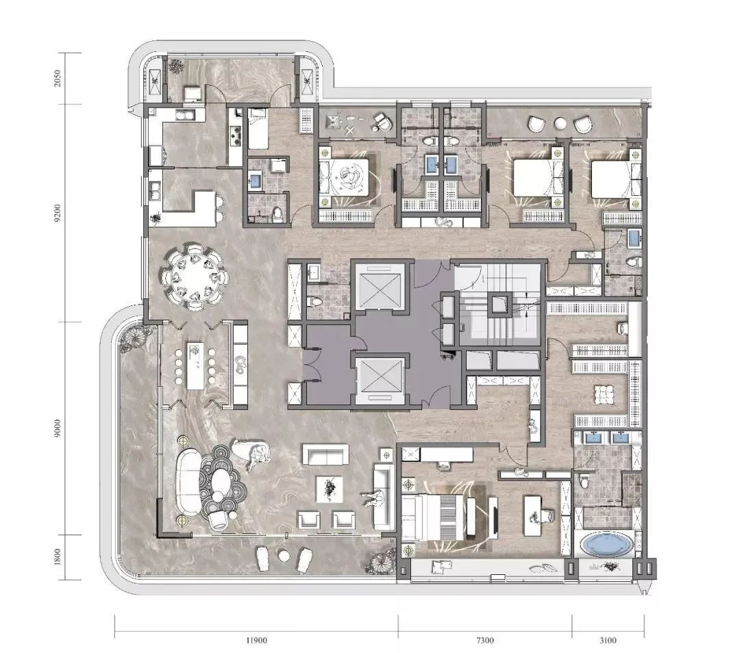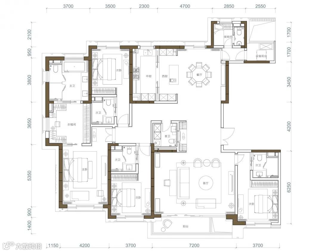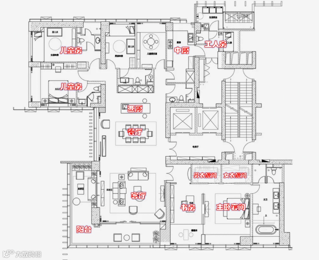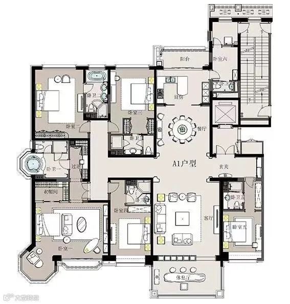 西安星河湾约415m²户型,做了6个卧室全都是套房设计。