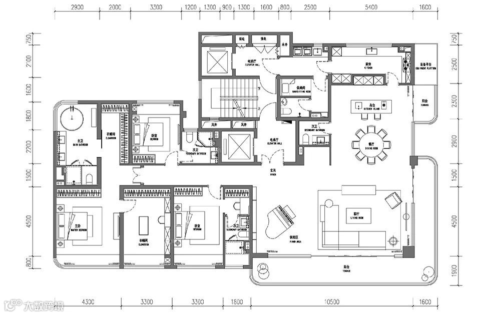 两部电梯自然划分出两条平行动线,将公区与家政动线分开,由主入口进门,便能感觉满满尊崇感。