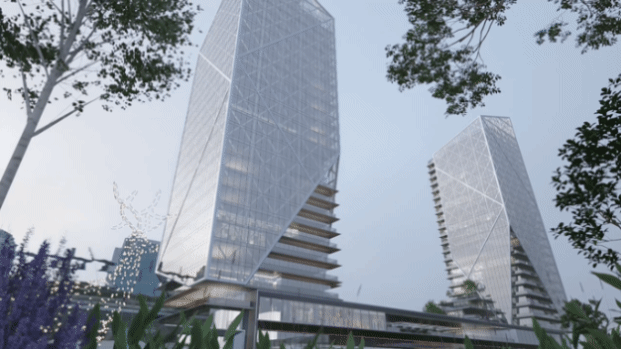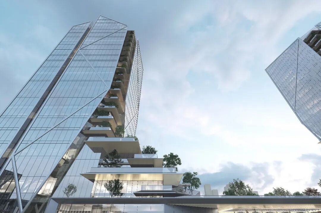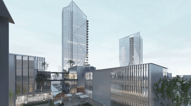 在商办区域的中心位置,高层办公以双子塔楼造型塔统领全域。