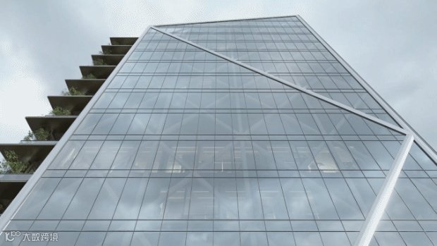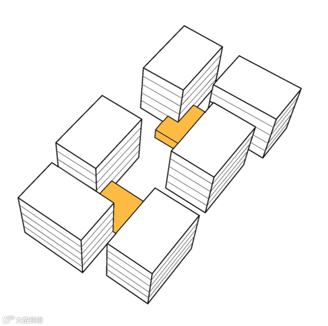 两个次级组团围合成一个组团;组团内部形成连续的商业界面,并通过凝聚性的开放节点,激发办公组团内部活力;组团内部设置多层级的办公露台,露台上植入运动、展陈、休闲等活动空间,形成办公空间的积极补充。