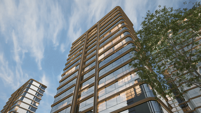 人文璀璨、长江之滨,设计抽象提取长江水流元素,赋予建筑。金色的流线划过建筑立面,留下一道道颀长的曲线,如金波在江上流转,是自然与人文的完美结合。采用公建化、全封阳台设计,成就简洁而现代的平滑立面;转角处采用弧形雕塑,凸显造型体的流动感。