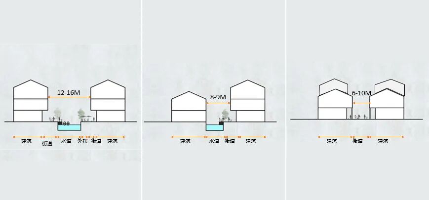 水街空间采用两街一河、一街一河、有街无河三种模式,创造丰富多变的空间体验;街道高宽比参照长街尺度,比例控制在0.5~1,让人感受亲切舒适的街巷氛围。