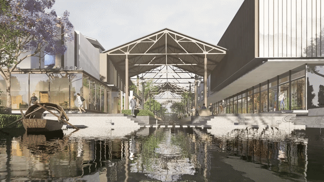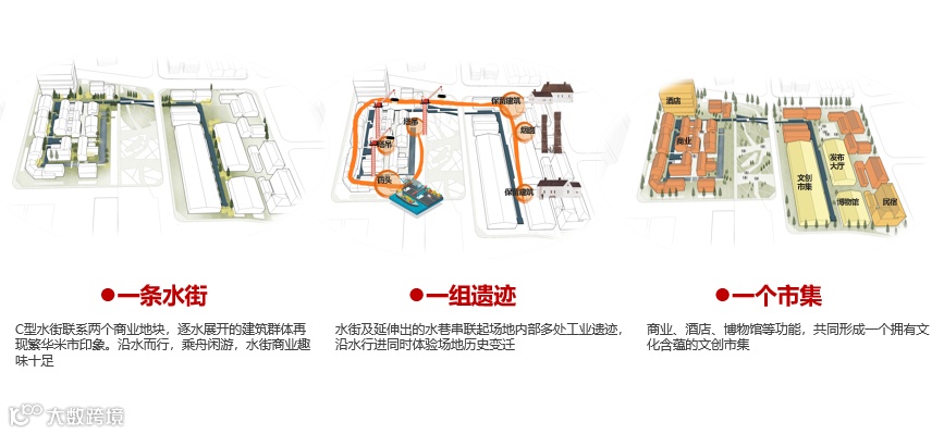 商业空间所在地块内有大量塔吊、龙门架等遗迹,工业氛围浓厚。布局上希望延续芜湖传统商贸集市“米市”的氛围特点,采用街区组团模式:以一条水街串联一组遗迹形成一个市集。