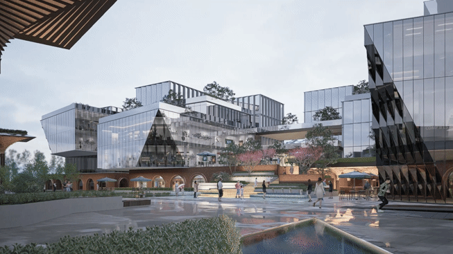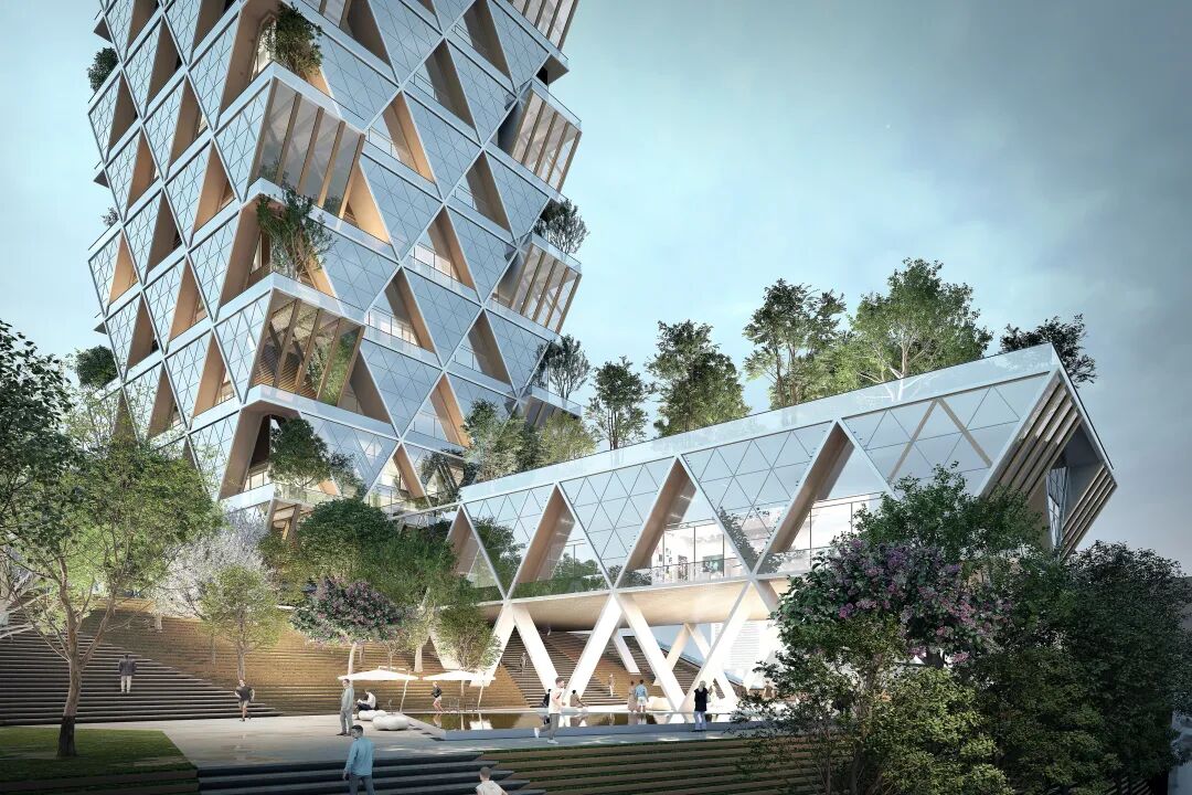 为体现高低层办公产品的差异度,创造更丰富的办公生态,我们将低层办公定位为:定制化的花园办公模式。采用“水平维度弹性生长、垂直聚落混合业态”的设计策略。