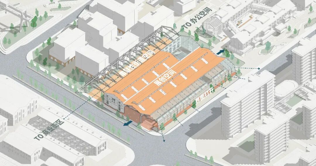 我们希望改造后的新建筑是一个共享、共融的开放社区。因此,我们将面向城市道路界面打开,使之成为一个城市活力面;东、西侧的展区、共享办公区采用双入口形式;北侧削弱建筑体量,将厂房空间外部化,实现东西向人行动线的串联。
